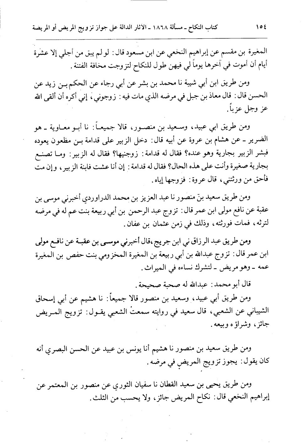 وَمِنْ طَرِيقِ سَعِيدِ بْنِ مَنْصُورٍ نا هُشَيْمٌ نا يُونُسُ بْنُ عُبَيْدٍ عَنْ الْحَسَنِ الْبَصْرِيِّ أَنَّهُ كَانَ يَقُولُ: يَجُوزُ تَزْوِيجُ الْمَرِيضِ فِي مَرَضِهِ.