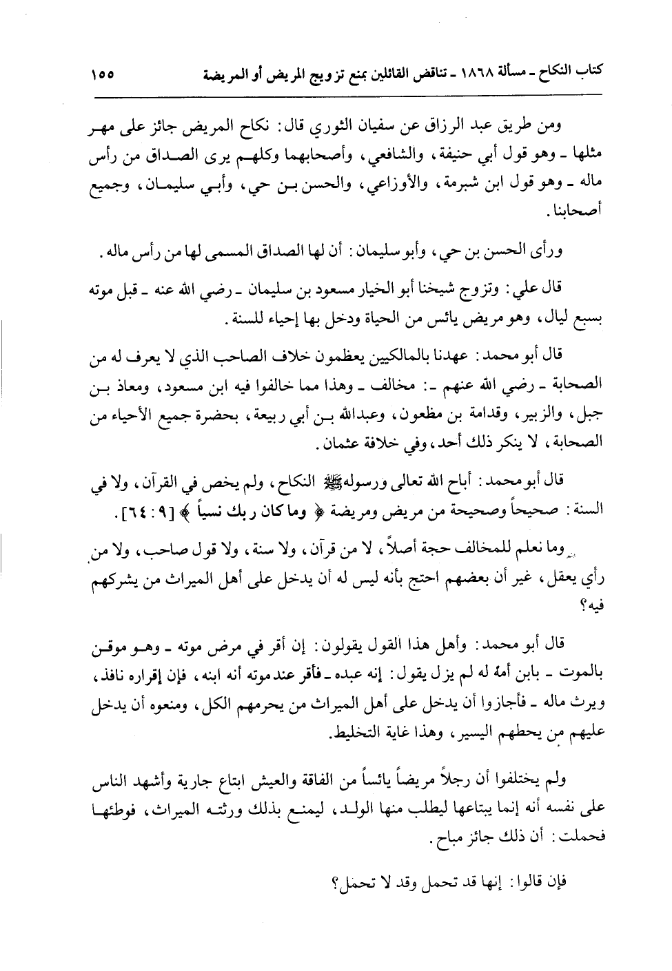 وَمِنْ طَرِيقِ عَبْدِ الرَّزَّاقِ عَنْ سُفْيَانَ الثَّوْرِيِّ قَالَ: نِكَاحُ الْمَرِيضِ جَائِزٌ عَلَى مَهْرِ مِثْلِهَا - وَهُوَ قَوْلُ أَبِي حَنِيفَةَ، وَالشَّافِعِيِّ، وَأَصْحَابِهِمَا وَكُلُّهُمْ يَرَى الصَّدَاقَ مِنْ رَأْسِ مَالِهِ - وَهُوَ قَوْلُ ابْنِ شُبْرُمَةَ، وَالْأَوْزَاعِيِّ، وَالْحَسَنِ بْنِ حَيٍّ، وَأَبِي سُلَيْمَانَ، وَجَمِيعِ أَصْحَابِنَا.