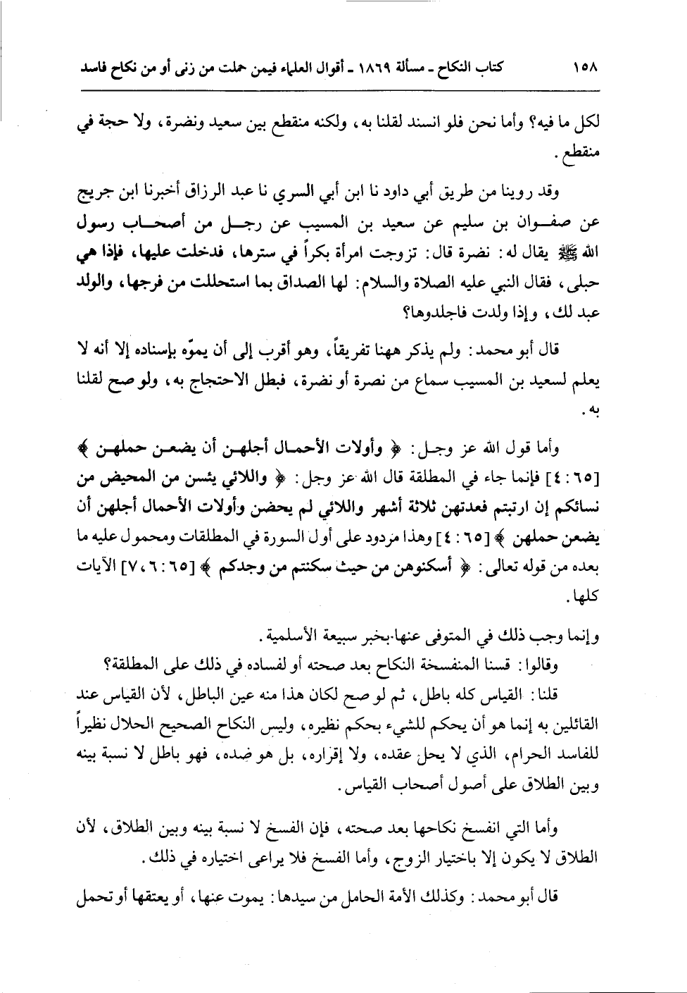 وَأَمَّا قَوْلُ اللَّهِ عَزَّ وَجَلَّ: {وَأُولاتُ الأَحْمَالِ أَجَلُهُنَّ أَنْ يَضَعْنَ حَمْلَهُنَّ} [الطلاق: 4] فَإِنَّمَا جَاءَ فِي الْمُطَلَّقَةِ قَالَ اللَّهُ عَزَّ وَجَلَّ: {وَاللائِي يَئِسْنَ مِنَ الْمَحِيضِ مِنْ نِسَائِكُمْ إِنِ ارْتَبْتُمْ فَعِدَّتُهُنَّ ثَلاثَةُ أَشْهُرٍ وَاللائِي لَمْ يَحِضْنَ وَأُولاتُ الأَحْمَالِ أَجَلُهُنَّ أَنْ يَضَعْنَ حَمْلَهُنَّ} [الطلاق: 4] وَهَذَا مَرْدُودٌ عَلَى أَوَّلِ السُّورَةِ فِي الْمُطَلَّقَاتِ وَمَحْمُولٌ عَلَيْهِ مَا بَعْدَهُ مِنْ قَوْله تَعَالَى: {أَسْكِنُوهُنَّ مِنْ حَيْثُ سَكَنْتُمْ مِنْ وُجْدِكُمْ} [الطلاق: 6] الْآيَاتِ كُلِّهَا.