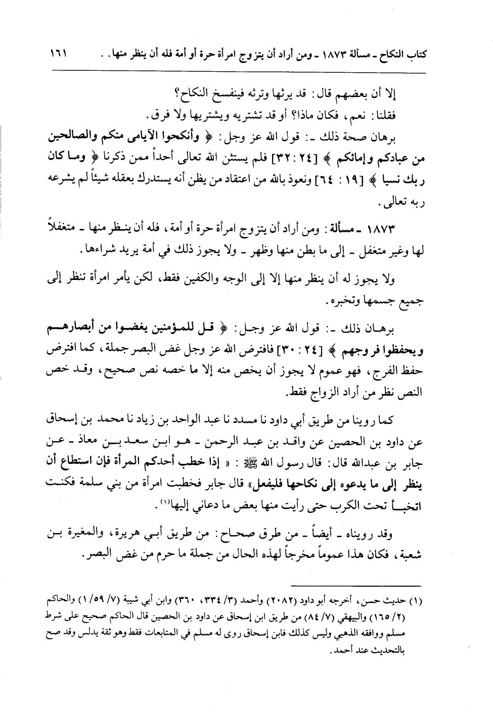 1873 - مَسْأَلَةٌ: وَمَنْ أَرَادَ أَنْ يَتَزَوَّجَ امْرَأَةً حُرَّةً أَوْ أَمَةً، فَلَهُ أَنْ يَنْظُرَ مِنْهَا - مُتَغَفِّلًا لَهَا وَغَيْرَ مُتَغَفِّلٍ - إلَى مَا بَطَنَ مِنْهَا وَظَهَرَ - وَلَا يَجُوزُ ذَلِكَ فِي أَمَةٍ يُرِيدُ شِرَاءَهَا.
