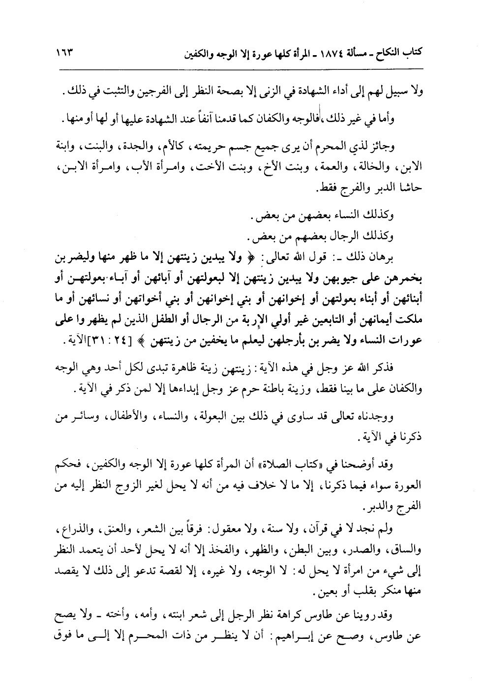 بُرْهَانُ ذَلِكَ: قَوْلُ اللَّهِ تَعَالَى: {وَلا يُبْدِينَ زِينَتَهُنَّ إِلا مَا ظَهَرَ مِنْهَا وَلْيَضْرِبْنَ بِخُمُرِهِنَّ عَلَى جُيُوبِهِنَّ وَلا يُبْدِينَ زِينَتَهُنَّ إِلا لِبُعُولَتِهِنَّ أَوْ آبَائِهِنَّ أَوْ آبَاءِ بُعُولَتِهِنَّ أَوْ أَبْنَائِهِنَّ أَوْ أَبْنَاءِ بُعُولَتِهِنَّ أَوْ إِخْوَانِهِنَّ أَوْ بَنِي إِخْوَانِهِنَّ أَوْ بَنِي أَخَوَاتِهِنَّ أَوْ نِسَائِهِنَّ أَوْ مَا مَلَكَتْ أَيْمَانُهُنَّ أَوِ التَّابِعِينَ غَيْرِ أُولِي الإِرْبَةِ مِنَ الرِّجَالِ أَوِ الطِّفْلِ الَّذِينَ لَمْ يَظْهَرُوا عَلَى عَوْرَاتِ النِّسَاءِ وَلا يَضْرِبْنَ بِأَرْجُلِهِنَّ لِيُعْلَمَ مَا يُخْفِينَ مِنْ زِينَتِهِنَّ} [النور: 31] الْآيَةَ.