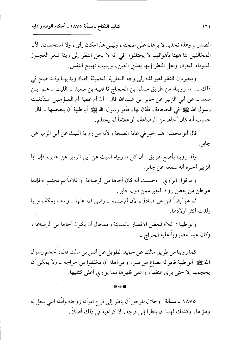 وَيُجِيزُونَ النَّظَرَ لِغَيْرِ لَذَّةٍ إلَى وَجْهِ الْجَارِيَةِ الْجَمِيلَةِ الْفَتَاةِ وَيَدَيْهَا وَقَدْ صَحَّ فِي ذَلِكَ -: مَا رُوِّينَاهُ مِنْ طَرِيقِ مُسْلِمِ بْنِ الْحَجَّاجِ نا قُتَيْبَةُ بْنُ سَعِيدٍ نا اللَّيْثُ هُوَ ابْنُ سَعْدٍ - عَنْ أَبِي الزُّبَيْرِ عَنْ جَابِرِ بْنِ عَبْدِ اللَّهِ قَالَ: «إنَّ أُمَّ عَطِيَّةَ أُمَّ الْمُؤْمِنِينَ اسْتَأْذَنَتْ رَسُولَ اللَّهِ - صَلَّى اللَّهُ عَلَيْهِ وَسَلَّمَ - فِي الْحِجَامَةِ، فَأَذِنَ لَهَا، فَأَمَرَ رَسُولُ اللَّهِ - صَلَّى اللَّهُ عَلَيْهِ وَسَلَّمَ - أَبَا طَيْبَةَ أَنْ يُحَجِّمَهَا - قَالَ: حَسِبْتُ أَنَّهُ كَانَ أَخَاهَا مِنْ الرَّضَاعَةِ، أَوْ غُلَامًا لَمْ يَحْتَلِمْ» .