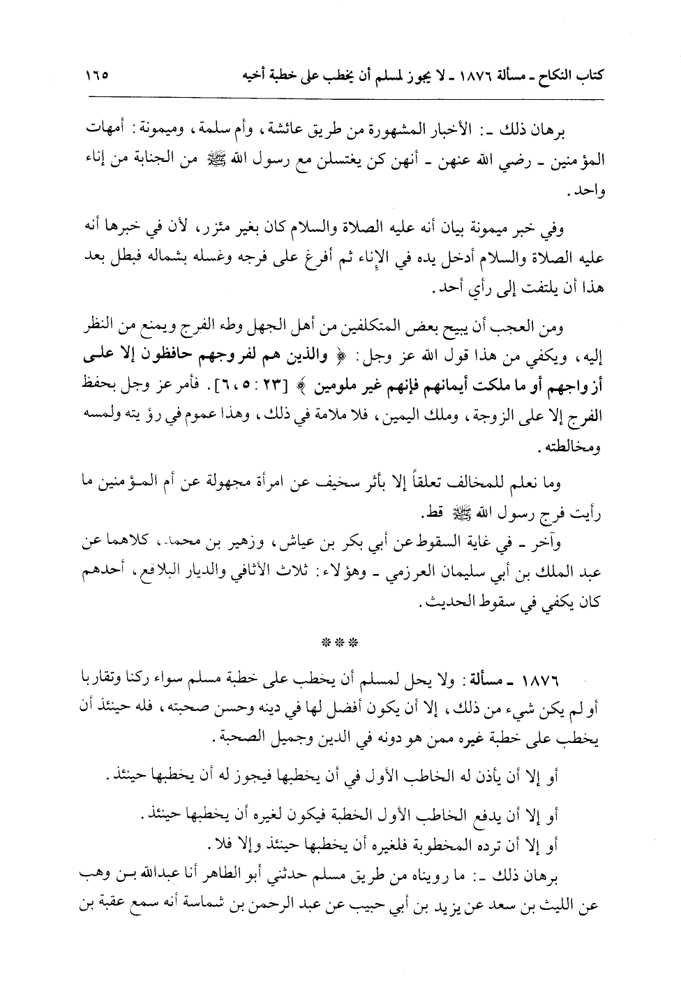 1876 - مَسْأَلَةٌ: وَلَا يَحِلُّ لِمُسْلِمٍ أَنْ يَخْطِبَ عَلَى خِطْبَةِ مُسْلِمٍ سَوَاءً رُكْنًا وَتَقَارُبًا أَوْ لَمْ يَكُنْ شَيْءٌ مِنْ ذَلِكَ، إلَّا أَنْ يَكُونَ أَفْضَلَ لَهَا فِي دِينِهِ وَحُسْنِ صُحْبَتِهِ، فَلَهُ حِينَئِذٍ أَنْ يَخْطِبَ عَلَى خِطْبَةِ غَيْرِهِ مِمَّنْ هُوَ دُونَهُ فِي الدِّينِ وَجَمِيلِ الصُّحْبَةِ.