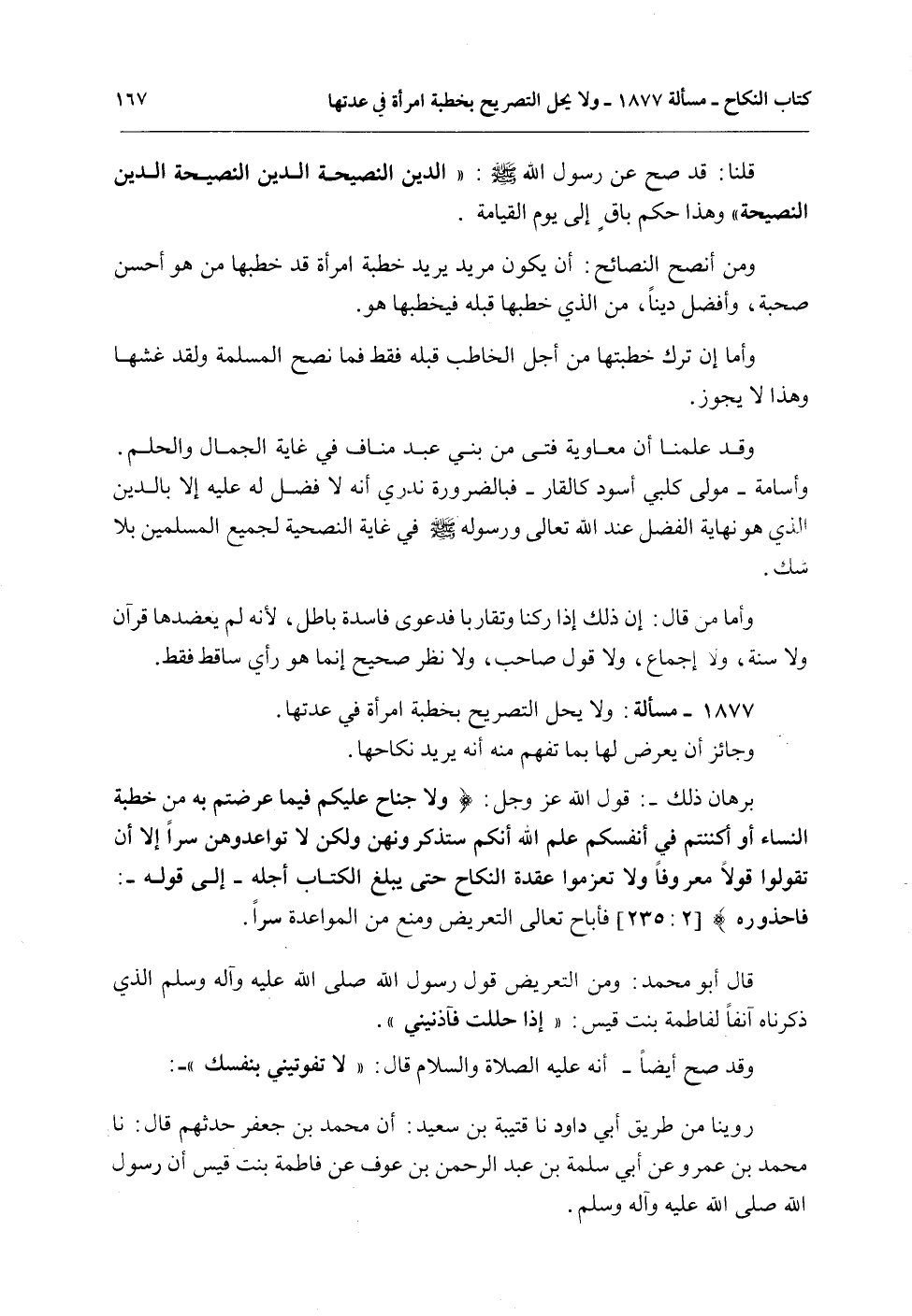 1877 - مَسْأَلَةٌ: وَلَا يَحِلُّ التَّصْرِيحُ بِخِطْبَةِ امْرَأَةٍ فِي عِدَّتِهَا.
