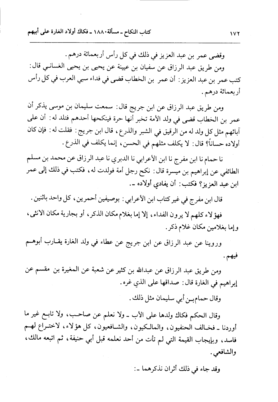 نا حُمَامٌ نا ابْنُ مُفَرِّجٍ نا ابْنُ الْأَعْرَابِيِّ نا الدَّبَرِيُّ نا عَبْدُ الرَّزَّاقِ عَنْ مُحَمَّدِ بْنِ مُسْلِمٍ الطَّائِفِيِّ عَنْ إبْرَاهِيمَ بْنِ مَيْسَرَةَ قَالَ: نَكَحَ رَجُلٌ أَمَةً فَوَلَدَتْ لَهُ، فَكَتَبَ فِي ذَلِكَ إلَى عُمَرَ بْنِ عَبْدِ الْعَزِيزِ؟ فَكَتَبَ: أَنْ يُفَادِيَ أَوْلَادَهُ -.