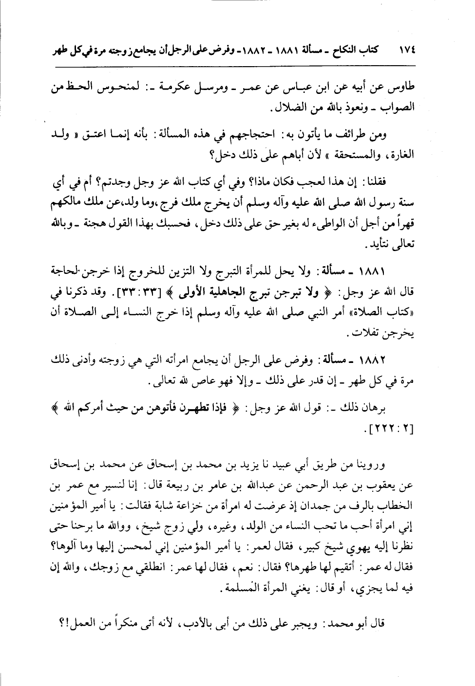 1882 - مَسْأَلَةٌ: وَفَرْضٌ عَلَى الرَّجُلِ أَنْ يُجَامِعَ امْرَأَتَهُ الَّتِي هِيَ زَوْجَتُهُ وَأَدْنَى ذَلِكَ مَرَّةٌ فِي كُلِّ طُهْرٍ - إنْ قَدَرَ عَلَى ذَلِكَ - وَإِلَّا فَهُوَ عَاصٍ لِلَّهِ تَعَالَى.