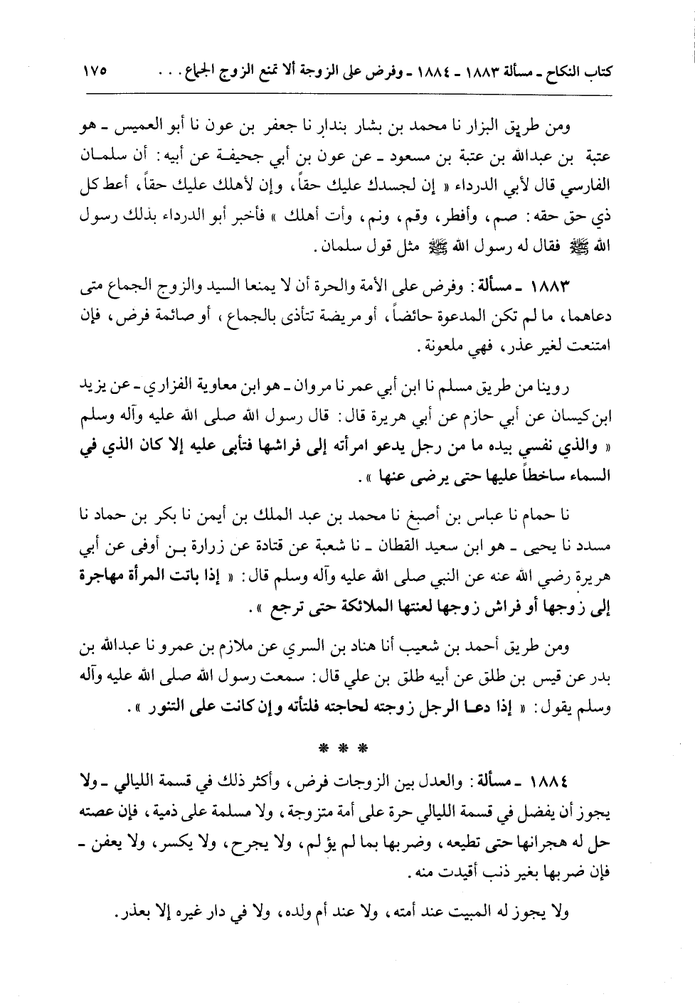 نا حُمَامٌ نا عَبَّاسُ بْنُ أَصْبَغَ نا مُحَمَّدُ بْنُ عَبْدِ الْمَلِكِ بْنِ أَيْمَنَ نا بَكْرُ بْنُ حَمَّادٍ نا مُسَدَّدٌ نا يَحْيَى - هُوَ ابْنُ سَعِيدٍ الْقَطَّانُ - نا شُعْبَةُ عَنْ قَتَادَةَ عَنْ زُرَارَةَ بْنِ أَوْفَى عَنْ أَبِي هُرَيْرَةَ - رَضِيَ اللَّهُ عَنْهُ - عَنْ النَّبِيِّ - صَلَّى اللَّهُ عَلَيْهِ وَآلِهِ وَسَلَّمَ - قَالَ: «إذَا بَاتَتْ الْمَرْأَةُ مُهَاجِرَةً إلَى زَوْجِهَا أَوْ فِرَاشِ زَوْجِهَا لَعَنَتْهَا الْمَلَائِكَةُ حَتَّى تَرْجِعَ» .