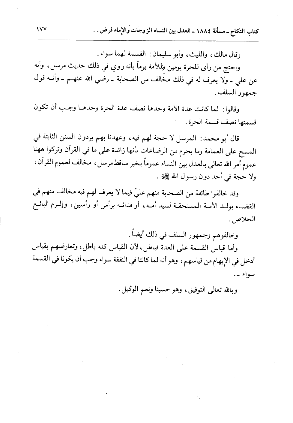 قَالَ أَبُو مُحَمَّدٍ: الْمُرْسَلُ لَا حُجَّةَ لَهُمْ فِيهِ، وَعَهِدْنَا بِهِمْ يَرُدُّونَ السُّنَنَ الثَّابِتَةَ فِي الْمَسْحِ عَلَى الْعِمَامَةِ وَمَا يَحْرُمُ مِنْ الرَّضَاعَاتِ بِأَنَّهَا زَائِدَةٌ عَلَى مَا فِي الْقُرْآنِ وَتَرَكُوا هَهُنَا عُمُومَ أَمْرِ اللَّهِ تَعَالَى بِالْعَدْلِ بَيْنَ النِّسَاءِ عُمُومًا بِخَبَرٍ سَاقِطٍ مُرْسَلٍ، مُخَالِفٍ لِعُمُومِ الْقُرْآنِ، وَلَا حُجَّةَ فِي أَحَدٍ دُونَ رَسُولِ اللَّهِ - صَلَّى اللَّهُ عَلَيْهِ وَسَلَّمَ -.