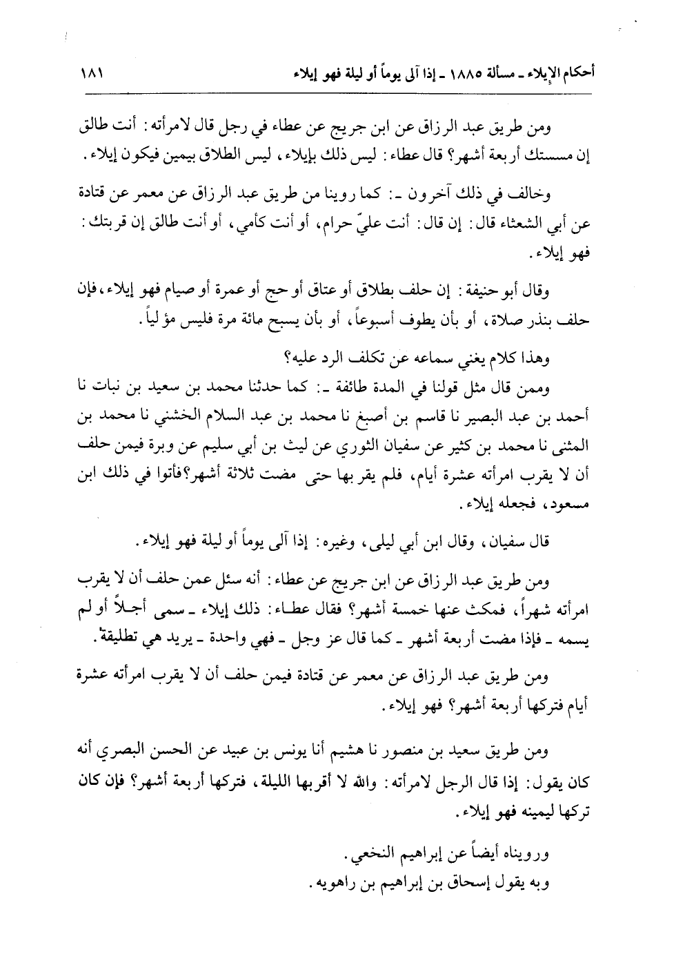 وَهَذَا كَلَامٌ يُغْنِي سَمَاعُهُ عَنْ تَكَلُّفِ الرَّدِّ عَلَيْهِ؟ وَمِمَّنْ قَالَ مِثْلَ قَوْلِنَا فِي الْمُدَّةِ طَائِفَةٌ -: كَمَا حَدَّثَنَا مُحَمَّدُ بْنُ سَعِيدِ بْنِ نَبَاتٍ نا أَحْمَدُ بْنُ عَبْدِ الْبَصِيرِ نا قَاسِمُ بْنُ أَصْبَغَ نا مُحَمَّدُ بْنُ عَبْدِ السَّلَامِ الْخُشَنِيُّ نا مُحَمَّدُ بْنُ الْمُثَنَّى نا مُحَمَّدُ بْنُ كَثِيرٍ عَنْ سُفْيَانَ الثَّوْرِيِّ عَنْ لَيْثِ بْنِ أَبِي سُلَيْمٍ عَنْ وَبَرَةَ فِيمَنْ حَلَفَ أَنْ لَا يَقْرَبَ امْرَأَتَهُ عَشْرَةَ أَيَّامٍ، فَلَمْ يَقْرَبْهَا حَتَّى مَضَتْ ثَلَاثَةُ أَشْهُرٍ؟ فَأَتَوْا فِي ذَلِكَ ابْنَ مَسْعُودٍ، فَجَعَلَهُ إيلَاءً.
