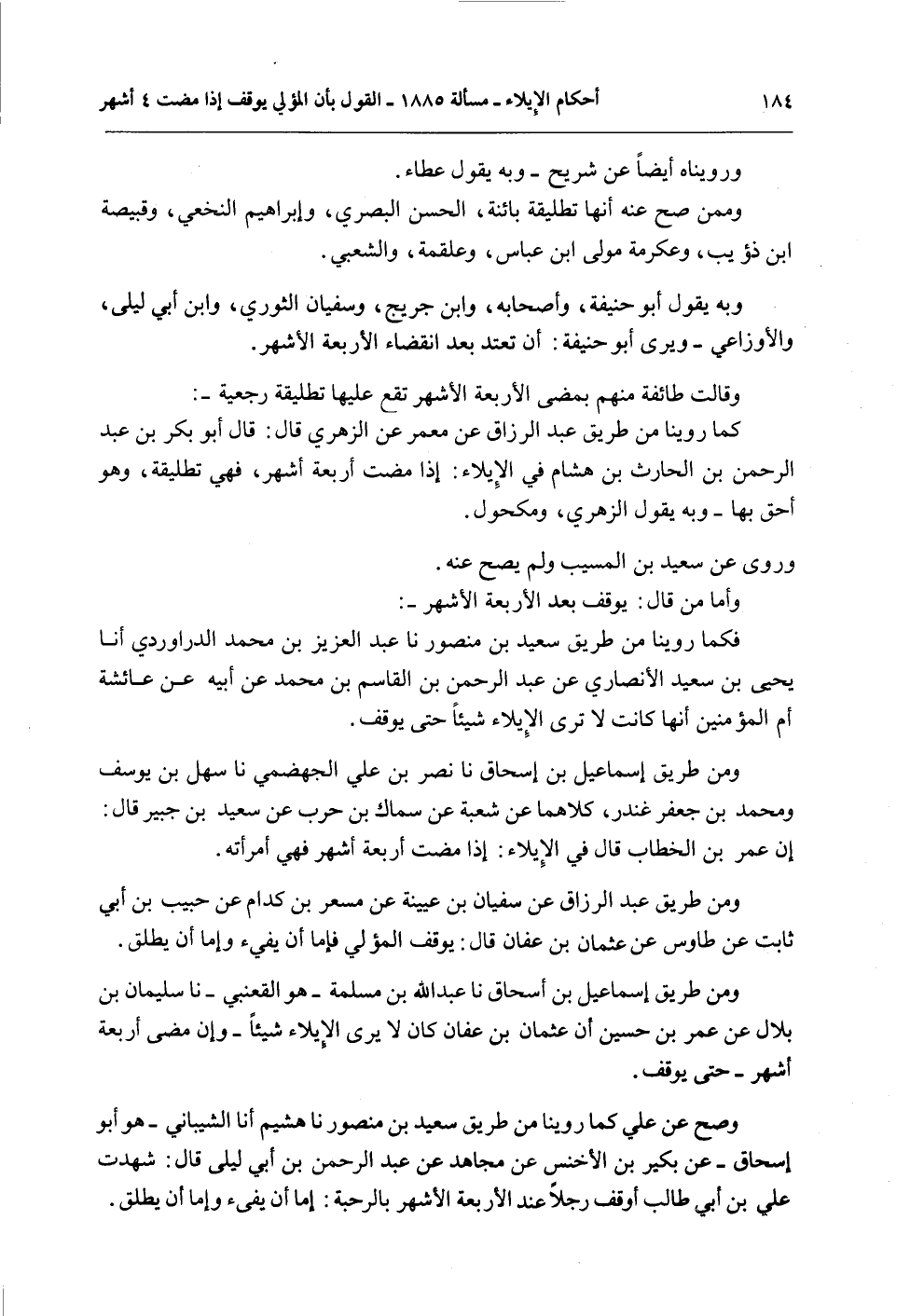 وَصَحَّ عَنْ عَلِيٍّ كَمَا رُوِّينَا مِنْ طَرِيقِ سَعِيدِ بْنِ مَنْصُورٍ نا هُشَيْمٌ نا الشَّيْبَانِيُّ - هُوَ أَبُو إِسْحَاقَ - عَنْ بُكَيْرِ بْنِ الْأَخْنَسِ عَنْ مُجَاهِدٍ عَنْ عَبْدِ الرَّحْمَنِ بْنِ أَبِي لَيْلَى قَالَ: شَهِدْتُ عَلِيَّ بْنَ أَبِي طَالِبٍ أَوْقَفَ رَجُلًا عِنْدَ الْأَرْبَعَةِ الْأَشْهُرِ بِالرَّحْبَةِ: إمَّا أَنْ يَفِيءَ وَإِمَّا أَنْ يُطَلِّقَ.