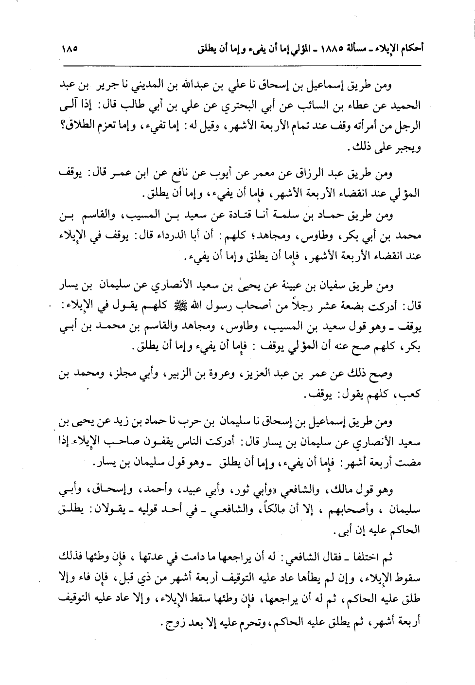 وَمِنْ طَرِيقِ سُفْيَانَ بْنِ عُيَيْنَةَ عَنْ يَحْيَى بْنِ سَعِيدٍ الْأَنْصَارِيِّ عَنْ سُلَيْمَانَ بْنِ يَسَارٍ قَالَ: أَدْرَكْتُ بِضْعَةَ عَشْرَ رَجُلًا مِنْ أَصْحَابِ رَسُولِ اللَّهِ - صَلَّى اللَّهُ عَلَيْهِ وَسَلَّمَ - كُلَّهُمْ يَقُولُ فِي الْإِيلَاءِ: يُوقَفُ - وَهُوَ قَوْلُ سَعِيدِ بْنِ الْمُسَيِّبِ، وَطَاوُسٍ، وَمُجَاهِدٍ وَالْقَاسِمِ بْنِ مُحَمَّدِ بْنِ أَبِي بَكْرٍ، كُلِّهِمْ صَحَّ عَنْهُ أَنَّ الْمُؤْلِيَ يُوقَفُ: فَإِمَّا أَنْ يَفِيءَ وَإِمَّا أَنْ يُطَلِّقَ.