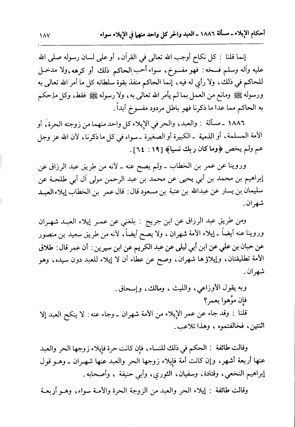 1886 - مَسْأَلَةٌ: وَالْعَبْدُ وَالْحُرُّ فِي الْإِيلَاءِ كُلُّ وَاحِدٍ مِنْهُمَا مِنْ زَوْجَتِهِ الْحُرَّةِ، أَوْ الْأَمَةِ الْمُسْلِمَةِ، أَوْ الذِّمِّيَّةِ - الْكَبِيرَةِ أَوْ الصَّغِيرَةِ - سَوَاءٌ فِي كُلِّ مَا ذَكَرْنَا، لِأَنَّ اللَّهَ عَزَّ وَجَلَّ عَمَّ وَلَمْ يَخُصَّ {وَمَا كَانَ رَبُّكَ نَسِيًّا} [مريم: 64] .