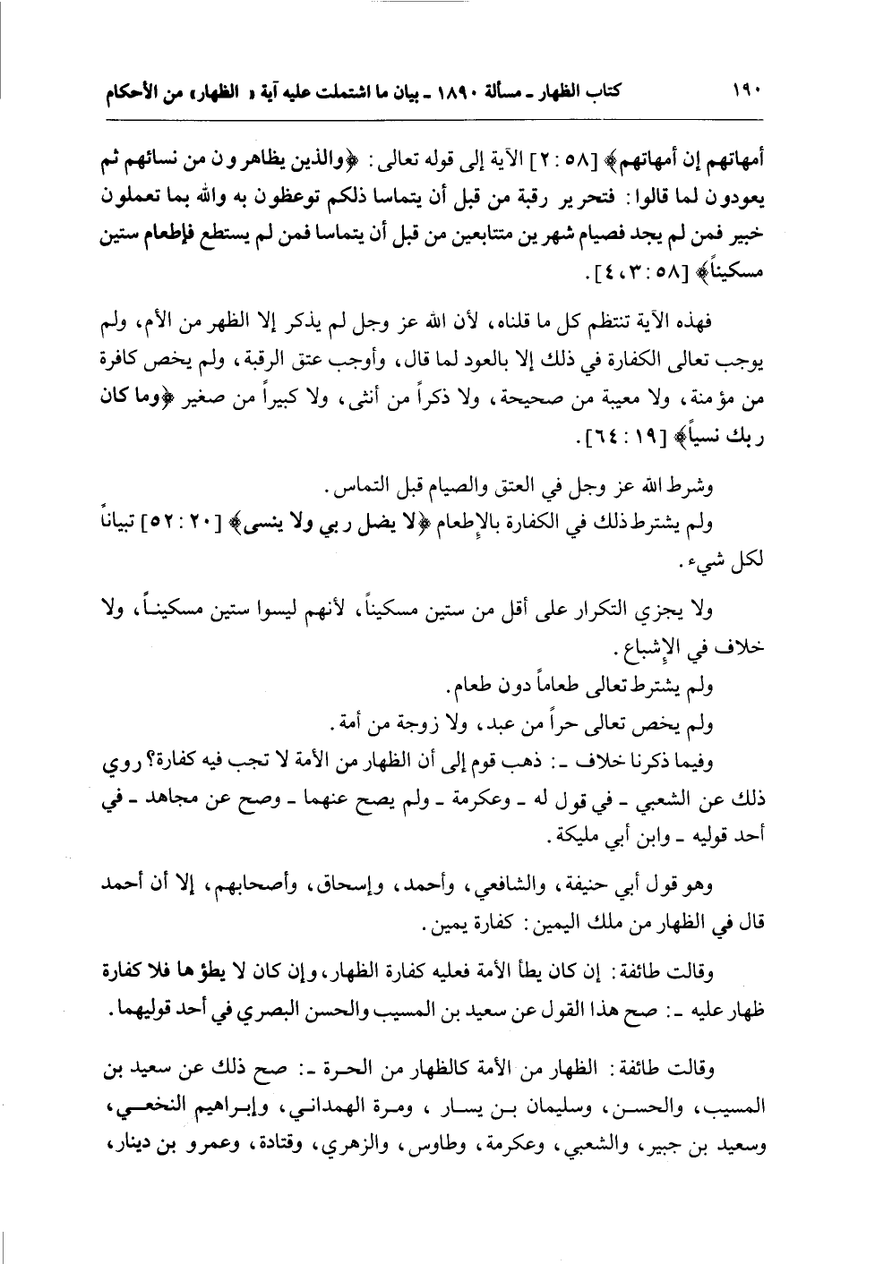 فَهَذِهِ الْآيَةُ تَنْتَظِمُ كُلَّ مَا قُلْنَاهُ، لِأَنَّ اللَّهَ عَزَّ وَجَلَّ لَمْ يَذْكُرْ إلَّا الظَّهْرَ مِنْ الْأُمِّ، وَلَمْ يُوجِبْ تَعَالَى الْكَفَّارَةَ فِي ذَلِكَ إلَّا بِالْعَوْدِ لِمَا قَالَ، وَأَوْجَبَ عِتْقَ الرَّقَبَةِ، وَلَمْ يَخُصَّ كَافِرَةً مِنْ مُؤْمِنَةٍ، وَلَا مَعِيبَةً مِنْ صَحِيحَةٍ، وَلَا ذَكَرًا مِنْ أُنْثَى، وَلَا كَبِيرًا مِنْ صَغِيرٍ {وَمَا كَانَ رَبُّكَ نَسِيًّا} [مريم: 64] .
