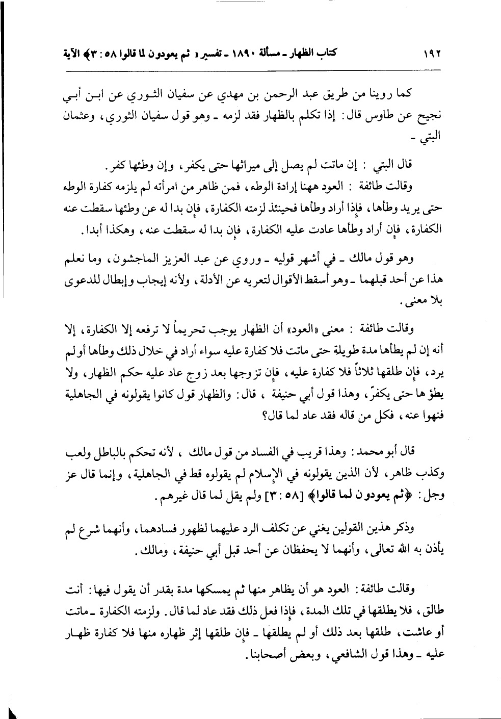 كَمَا رُوِّينَا مِنْ طَرِيقِ عَبْدِ الرَّحْمَنِ بْنِ مَهْدِيٍّ عَنْ سُفْيَانَ الثَّوْرِيِّ عَنْ ابْنِ أَبِي نَجِيحٍ عَنْ طَاوُسٍ قَالَ: إذَا تَكَلَّمَ بِالظِّهَارِ فَقَدْ لَزِمَهُ - وَهُوَ قَوْلُ سُفْيَانَ الثَّوْرِيِّ، وَعُثْمَانَ الْبَتِّيِّ - قَالَ الْبَتِّيُّ: إنْ مَاتَتْ لَمْ يَصِلْ إلَى مِيرَاثِهَا حَتَّى يُكَفِّرَ، وَإِنْ وَطِئَهَا كَفَرَ.