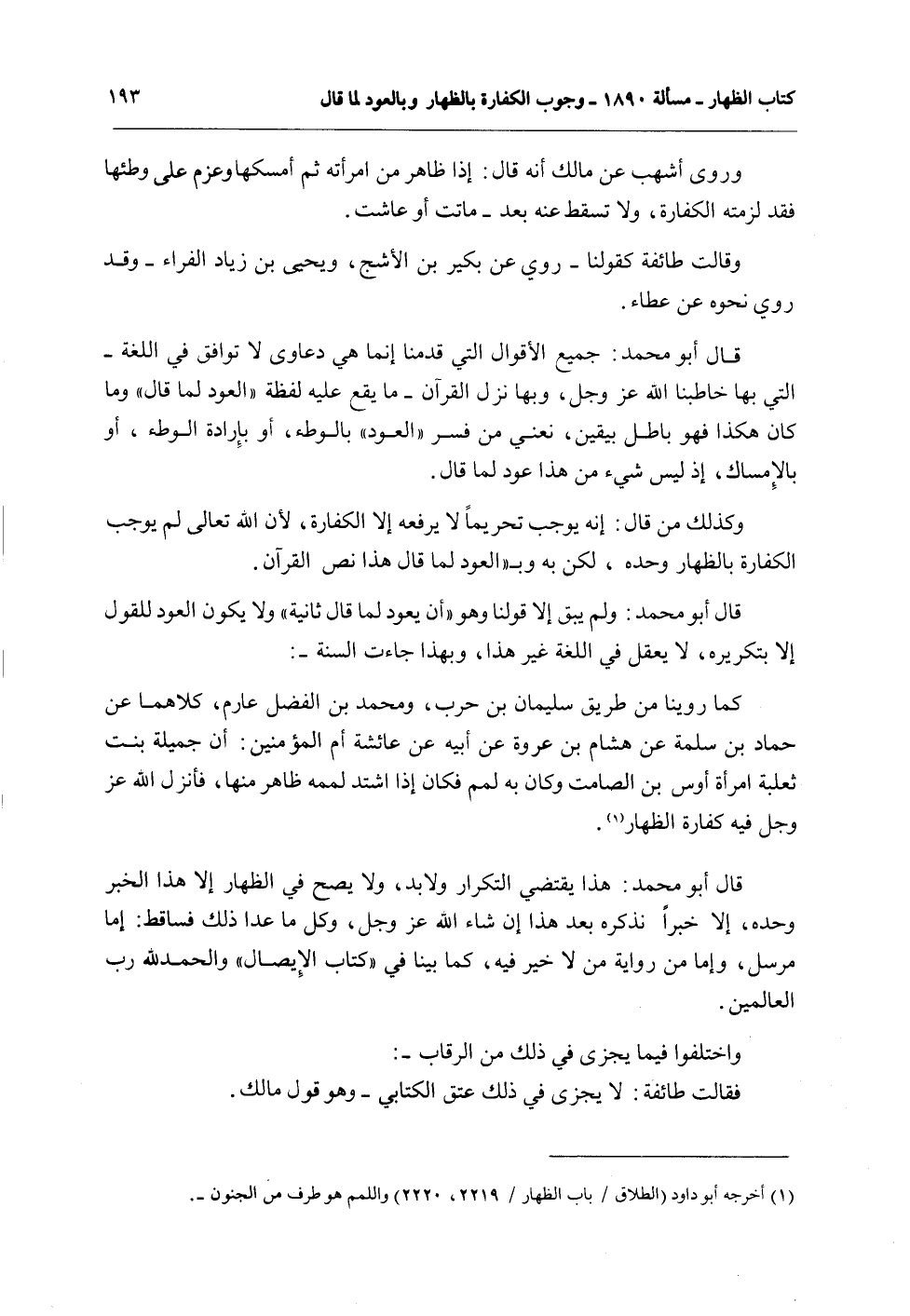 قَالَ أَبُو مُحَمَّدٍ: جَمِيعُ الْأَقْوَالِ الَّتِي قَدَّمْنَا إنَّمَا هِيَ دَعَاوَى لَا تُوَافِقُ فِي اللُّغَةِ - الَّتِي بِهَا خَاطَبَنَا اللَّهُ عَزَّ وَجَلَّ، وَبِهَا نَزَلَ الْقُرْآنُ - مَا يَقَعُ عَلَيْهِ لَفْظَةُ " الْعَوْدِ لِمَا قَالَ " وَمَا كَانَ هَكَذَا فَهُوَ بَاطِلٌ بِيَقِينٍ، نَعْنِي مَنْ فَسَّرَ " الْعَوْدَ " بِالْوَطْءِ، أَوْ بِإِرَادَةِ الْوَطْءِ، أَوْ بِالْإِمْسَاكِ، إذْ لَيْسَ شَيْءٌ مِنْ هَذَا عَوْدًا لِمَا قَالَ.