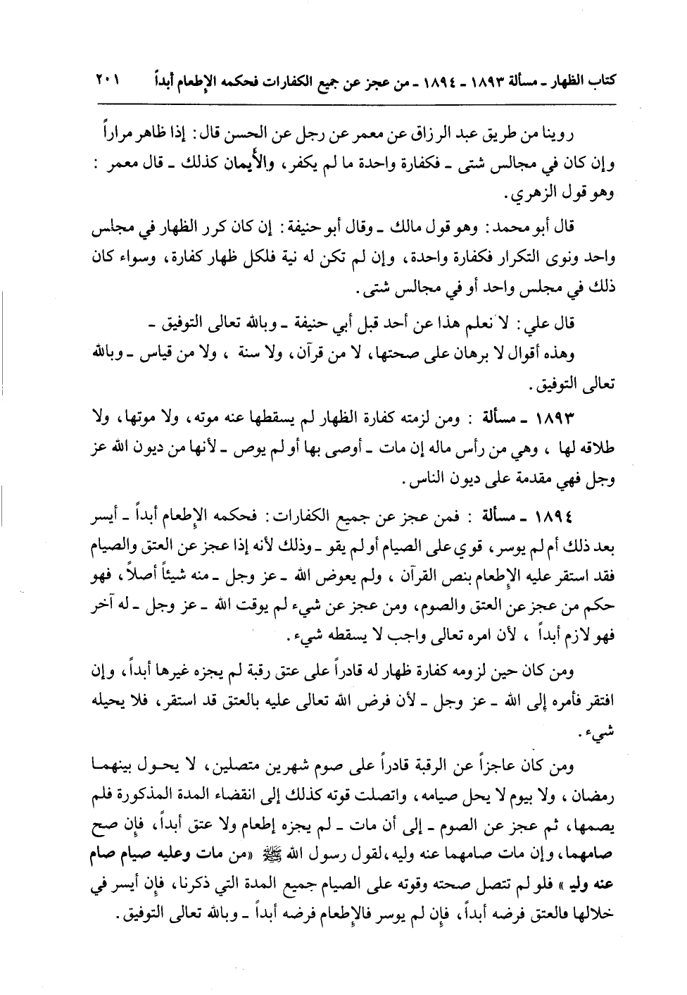 1893 - مَسْأَلَةٌ: وَمَنْ لَزِمَتْهُ كَفَّارَةُ الظِّهَارِ لَمْ يُسْقِطْهَا عَنْهُ مَوْتُهُ، وَلَا مَوْتُهَا، وَلَا طَلَاقُهُ لَهَا، وَهِيَ مِنْ رَأْسِ مَالِهِ إنْ مَاتَ - أَوْصَى بِهَا أَوْ لَمْ يُوصِ - لِأَنَّهَا مِنْ دُيُونِ اللَّهِ عَزَّ وَجَلَّ فَهِيَ مُقَدَّمَةٌ عَلَى دُيُونِ النَّاسِ.