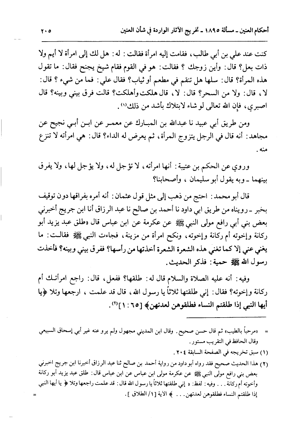وَرُوِيَ عَنْ الْحَكَمِ بْنِ عُتَيْبَةَ: أَنَّهَا امْرَأَتُهُ، لَا تُؤَجَّلُ لَهُ، وَلَا يُؤَجَّلُ لَهَا، وَلَا يُفَرَّقُ بَيْنَهُمَا -، وَبِهِ يَقُولُ أَبُو سُلَيْمَانَ، وَأَصْحَابُنَا؟ قَالَ أَبُو مُحَمَّدٍ: احْتَجَّ مَنْ ذَهَبَ إلَى مِثْلِ قَوْلِ عُثْمَانَ: أَنَّهُ أَمَرَهُ بِفِرَاقِهَا دُونَ تَوْقِيفٍ بِخَبَرٍ - رُوِّينَاهُ مِنْ طَرِيقِ أَبِي دَاوُد نا أَحْمَدُ بْنُ صَالِحٍ نا عَبْدُ الرَّزَّاقِ نا ابْنُ جُرَيْجٍ أَخْبَرَنِي بَعْضُ بَنِي أَبِي رَافِعٍ مَوْلَى النَّبِيِّ - صَلَّى اللَّهُ عَلَيْهِ وَسَلَّمَ - عَنْ عِكْرِمَةَ عَنْ ابْنِ عَبَّاسٍ قَالَ «طَلَّقَ عَبْدُ يَزِيدَ أَبُو رُكَانَةَ وَإِخْوَتِهِ أُمَّ رُكَانَةَ وَإِخْوَتِهِ، وَنَكَحَ امْرَأَةً مِنْ مُزَيْنَةَ، فَجَاءَتْ النَّبِيَّ - صَلَّى اللَّهُ عَلَيْهِ وَسَلَّمَ - فَقَالَتْ: مَا يُغْنِي عَنِّي إلَّا كَمَا تُغْنِي هَذِهِ الشَّعْرَةُ لِشَعْرَةٍ أَخَذَتْهَا مِنْ رَأْسِهَا؟ فَفَرِّقْ بَيْنِي وَبَيْنَهُ؟ فَأَخَذَتْ رَسُولَ اللَّهِ - صَلَّى اللَّهُ عَلَيْهِ وَسَلَّمَ - حَمِيَّةٌ: فَذَكَرَ الْحَدِيثَ»