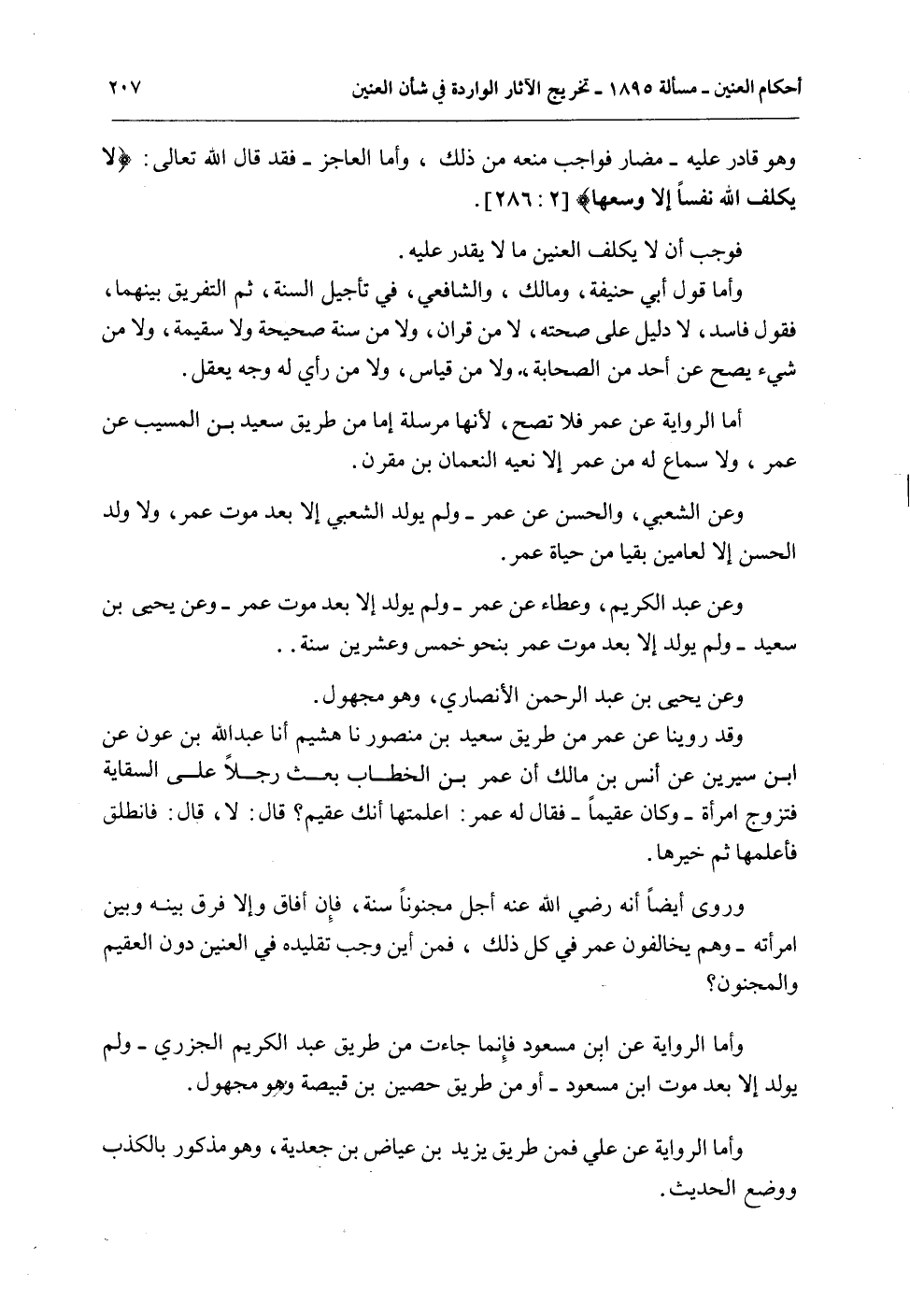 وَرُوِيَ أَيْضًا أَنَّهُ - رَضِيَ اللَّهُ عَنْهُ - أَجَّلَ مَجْنُونًا سَنَةً، فَإِنْ أَفَاقَ وَإِلَّا فَرَّقَ بَيْنَهُ وَبَيْنَ امْرَأَتِهِ - وَهُمْ يُخَالِفُونَ عُمَرَ فِي ذَلِكَ، فَمِنْ أَيْنَ وَجَبَ تَقْلِيدُهُ فِي الْعِنِّينِ دُونَ الْعَقِيمِ وَالْمَجْنُونِ؟ وَأَمَّا الرِّوَايَةُ عَنْ ابْنِ مَسْعُودٍ فَإِنَّمَا جَاءَتْ مِنْ طَرِيقِ عَبْدِ الْكَرِيمِ الْجَزَرِيِّ - وَلَمْ يُولَدْ إلَّا بَعْدَ مَوْتِ ابْنِ مَسْعُودٍ أَوْ مِنْ طَرِيقِ حُصَيْنِ بْنِ قَبِيصَةَ وَهُوَ مَجْهُولٌ