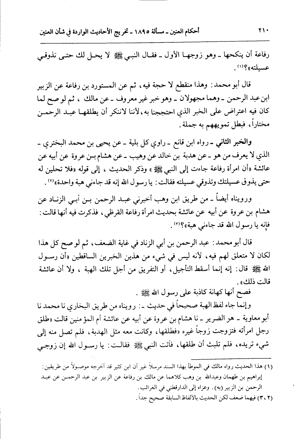قَالَ أَبُو مُحَمَّدٍ: وَهَذَا مُنْقَطِعٌ لَا حُجَّةَ فِيهِ، ثُمَّ عَنْ الْمُسْتَوْرِدِ بْنِ رِفَاعَةَ عَنْ الزُّبَيْرِ بْنِ عَبْدِ الرَّحْمَنِ - وَهُمَا مَجْهُولَانِ - وَهُوَ خَبَرٌ غَيْرُ مَعْرُوفٍ - عَنْ مَالِكٍ، ثُمَّ لَوْ صَحَّ لَمَا كَانَ فِيهِ اعْتِرَاضٌ عَلَى الْخَبَرِ الَّذِي احْتَجَجْنَا بِهِ، لِأَنَّنَا لَا نُنْكِرُ أَنْ يُطَلِّقَهَا عَبْدُ الرَّحْمَنِ مُخْتَارًا، فَبَطَلَ تَمْوِيهُهُمْ بِهِ جُمْلَةً