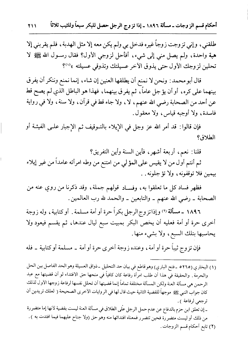 طَلَّقَنِي، وَإِنِّي تَزَوَّجْت زَوْجًا غَيْرَهُ فَدَخَلَ بِي وَلَمْ يَكُنْ مَعَهُ إلَّا مِثْلُ الْهُدْبَةِ، فَلَمْ يَقْرَبْنِي إلَّا هِبَةً وَاحِدَةً، وَلَمْ يَصِلْ مِنِّي إلَى شَيْءٍ، أَفَأَحِلُّ لِزَوْجِي الْأَوَّلِ؟ فَقَالَ رَسُولُ اللَّهِ - صَلَّى اللَّهُ عَلَيْهِ وَسَلَّمَ - لَا تَحِلِّينَ لِزَوْجِك الْأَوَّلِ حَتَّى يَذُوقَ الْآخَرُ عُسَيْلَتَكِ وَتَذُوقِي عُسَيْلَتَهُ» ؟ قَالَ أَبُو مُحَمَّدٍ: وَنَحْنُ لَا نَمْنَعُ أَنْ يُطَلِّقَهَا الْعِنِّينُ إنْ شَاءَ، إنَّمَا نَمْنَعُ وَنُنْكِرُ أَنْ يُفَرَّقَ بَيْنَهُمَا عَلَى كُرْهٍ، أَوْ أَنْ يُؤَجَّلَ عَامًا، ثُمَّ يُفَرَّقَ بَيْنَهُمَا، فَهَذَا هُوَ الْبَاطِلُ الَّذِي لَمْ يَصِحَّ قَطُّ عَنْ أَحَدٍ مِنْ الصَّحَابَةِ - رَضِيَ اللَّهُ عَنْهُمْ -، لَا، وَلَا جَاءَ قَطُّ فِي قُرْآنٍ، وَلَا سُنَّةٍ، وَلَا فِي رِوَايَةٍ فَاسِدَةٍ، وَلَا أَوْجَبَهُ قِيَاسٌ، وَلَا مَعْقُولٌ