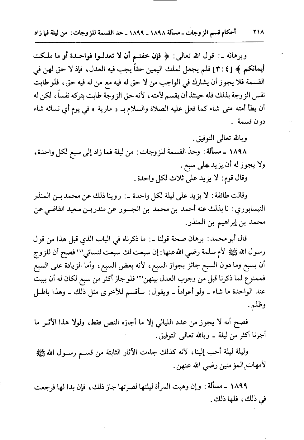 قَالَ أَبُو مُحَمَّدٍ: بُرْهَانُ صِحَّةِ قَوْلِنَا -: مَا ذَكَرْنَاهُ فِي الْبَابِ الَّذِي قَبْلَ هَذَا مِنْ قَوْلِ رَسُولِ اللَّهِ - صَلَّى اللَّهُ عَلَيْهِ وَسَلَّمَ - لِأُمِّ سَلَمَةَ - رَضِيَ اللَّهُ عَنْهَا -: «إنْ سَبَّعْتُ لَكِ سَبَّعْتُ لِنِسَائِي» فَصَحَّ أَنَّ لِلزَّوْجِ أَنْ يُسَبِّعَ وَمَا دُونَ السَّبْعِ جَائِزٌ بِجَوَازِ السَّبْعِ، لِأَنَّهُ بَعْضُ السَّبْعِ، وَأَمَّا الزِّيَادَةُ عَلَى السَّبْعِ فَمَمْنُوعٌ لِمَا ذَكَرْنَا قَبْلُ مِنْ وُجُوبِ الْعَدْلِ بَيْنَهُنَّ فَلَوْ جَازَ أَكْثَرُ مِنْ سَبْعٍ لَكَانَ لَهُ أَنْ يَبِيتَ عِنْدَ الْوَاحِدَةِ مَا شَاءَ - وَلَوْ أَعْوَامًا - وَيَقُولُ: سَأَقْسِمُ لِلْأُخْرَى مِثْلَ ذَلِكَ - وَهَذَا بَاطِلٌ وَظُلْمٌ.