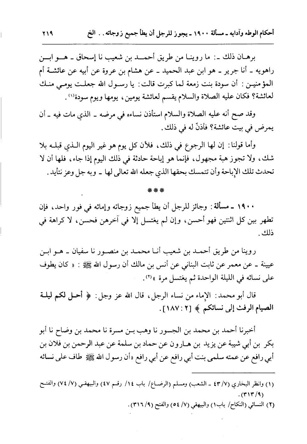 أَحْكَامُ الْوَطْءِ وَآدَابُهُ 1900 - مَسْأَلَةٌ: وَجَائِزٌ لِلرَّجُلِ أَنْ يَطَأَ جَمِيعَ زَوْجَاتِهِ وَإِمَائِهِ فِي فَوْرٍ وَاحِدٍ، فَإِنْ تَطَهَّرَ بَيْنَ كُلِّ اثْنَتَيْنِ فَهُوَ أَحْسَنُ، وَإِنْ لَمْ يَغْتَسِلْ إلَّا فِي آخِرِهِنَّ فَحَسَنٌ، لَا كَرَاهَةَ فِي ذَلِكَ