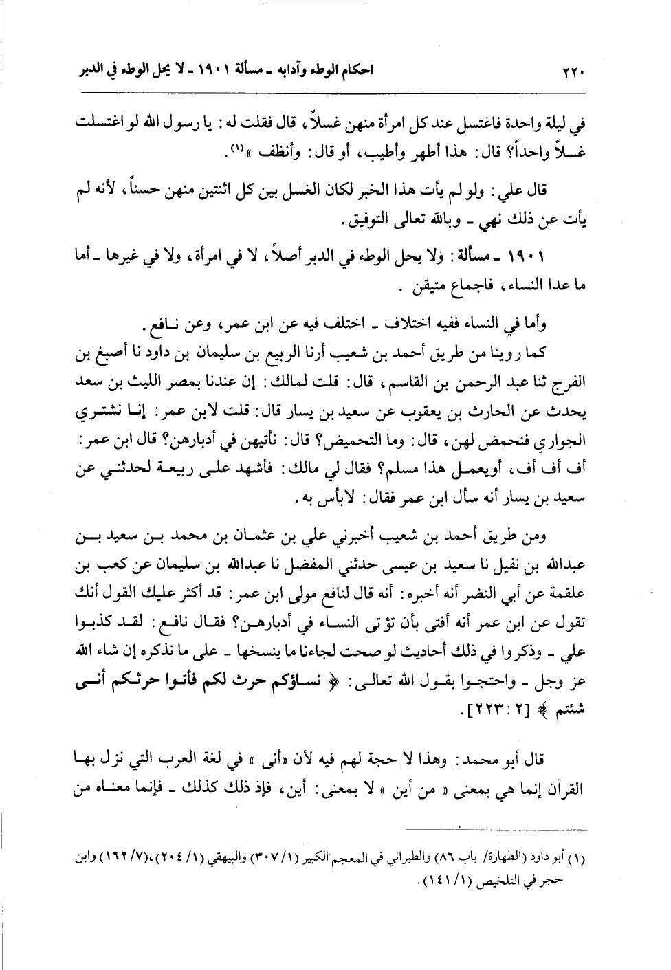 1901 - مَسْأَلَةٌ: وَلَا يَحِلُّ الْوَطْءُ فِي الدُّبُرِ أَصْلًا، لَا فِي امْرَأَةٍ وَلَا فِي غَيْرِهَا - أَمَّا مَا عَدَا النِّسَاءَ، فَإِجْمَاعٌ مُتَيَقَّنٌ. وَأَمَّا فِي النِّسَاءِ فَفِيهِ اخْتِلَافٌ - اُخْتُلِفَ فِيهِ عَنْ ابْنِ عُمُرَ، وَعَنْ نَافِعٍ كَمَا رَوَيْنَا مِنْ طَرِيقِ أَحْمَدَ بْنِ شُعَيْبٍ أرنا الرَّبِيعُ بْنُ سُلَيْمَانَ بْنِ دَاوُد نا أُصْبَغُ بْنُ الْفَرَجِ ثَنَا عَبْدُ الرَّحْمَنِ بْنِ الْقَاسِمِ، قَالَ: قُلْت لِمَالِكٍ: إنَّ عِنْدنَا بِمِصْرَ اللَّيْثَ بْنَ سَعْدٍ يُحَدِّثُ عَنْ الْحَارِثِ بْنِ يَعْقُوبَ عَنْ سَعِيدِ بْنِ يَسَارٍ قَالَ: قُلْت لَابْنِ عُمُرَ: إنَّا نَشْتَرِي الْجَوَارِيَ فَنُحَمِّضُ لَهُنَّ، قَالَ: وَمَا التَّحْمِيضُ؟ قَالَ: نَأْتِيهِنَّ فِي أَدْبَارِهِنَّ؟ قَالَ ابْنُ عُمُرَ: أُفٍّ أُفٍّ أُفٍّ، أَوَ يَعْمَلُ هَذَا مُسْلِمٌ؟ فَقَالَ لِي مَالِكٌ: فَأَشْهَدُ عَلَى رَبِيعَةَ لَحَدَّثَنِي عَنْ سَعِيدِ بْنِ يَسَارٍ أَنَّهُ سَأَلَ ابْنَ عُمُرَ فَقَالَ: لَا بَأْسَ بِهِ. وَمِنْ طَرِيقِ أَحْمَدَ بْنِ شُعَيْبٍ أَخْبَرَنِي عَلِيُّ بْنُ عُثْمَانَ بْنِ مُحَمَّدِ بْنِ سَعِيدِ بْنِ عَبْدِ اللَّهِ بْنِ نُفَيْلٍ نا سَعِيدُ بْنُ عِيسَى حَدَّثَنِي الْمُفَضَّلُ نا عَبْدُ اللَّهِ بْنُ سُلَيْمَانَ عَنْ كَعْبِ بْنِ عَلْقَمَةَ عَنْ أَبِي النَّضْرِ أَنَّهُ أَخْبَرَهُ: أَنَّهُ قَالَ لِنَافِعٍ مَوْلَى ابْنِ عُمُرَ: قَدْ أَكْثَرَ عَلَيْك الْقَوْلَ أَنَّك تَقُولُ عَنْ ابْنِ عُمُرَ أَنَّهُ أَفَتَى بِأَنَّ تُؤْتَى النِّسَاءُ فِي أَدْبَارِهِنَّ؟ فَقَالَ نَافِعٌ: لَقَدْ كَذَبُوا عَلَيَّ - وَذَكَرُوا فِي ذَلِكَ أَحَادِيثَ لَوْ صَحَّتْ لَجَاءَنَا مَا يَنْسَخُهَا - عَلَى مَا نَذْكُرُهُ إنْ شَاءَ اللَّه عَزَّ وَجَلّ - وَاحْتَجُّوا بِقَوْلِ اللَّهِ تَعَالَى: {نِسَاؤُكُمْ حَرْثٌ لَكُمْ فَأْتُوا حَرْثَكُمْ أَنَّى شِئْتُمْ} [البقرة: 223] . قَالَ أَبُو مُحَمَّدٍ: وَهَذَا لَا حَجَّةَ لَهُمْ فِيهِ لِأَنَّ " أَنَّى " فِي لُغَةِ الْعَرَبِ الَّتِي نَزَلَ بِهَا الْقُرْآنُ إنَّمَا هِيَ بِمَعْنَى " مِنْ أَيْنَ " لَا بِمَعْنَى: أَيْنَ، فَإِذْ ذَلِكَ كَذَلِكَ - فَإِنَّمَا مَعْنَاهُ مِنْ