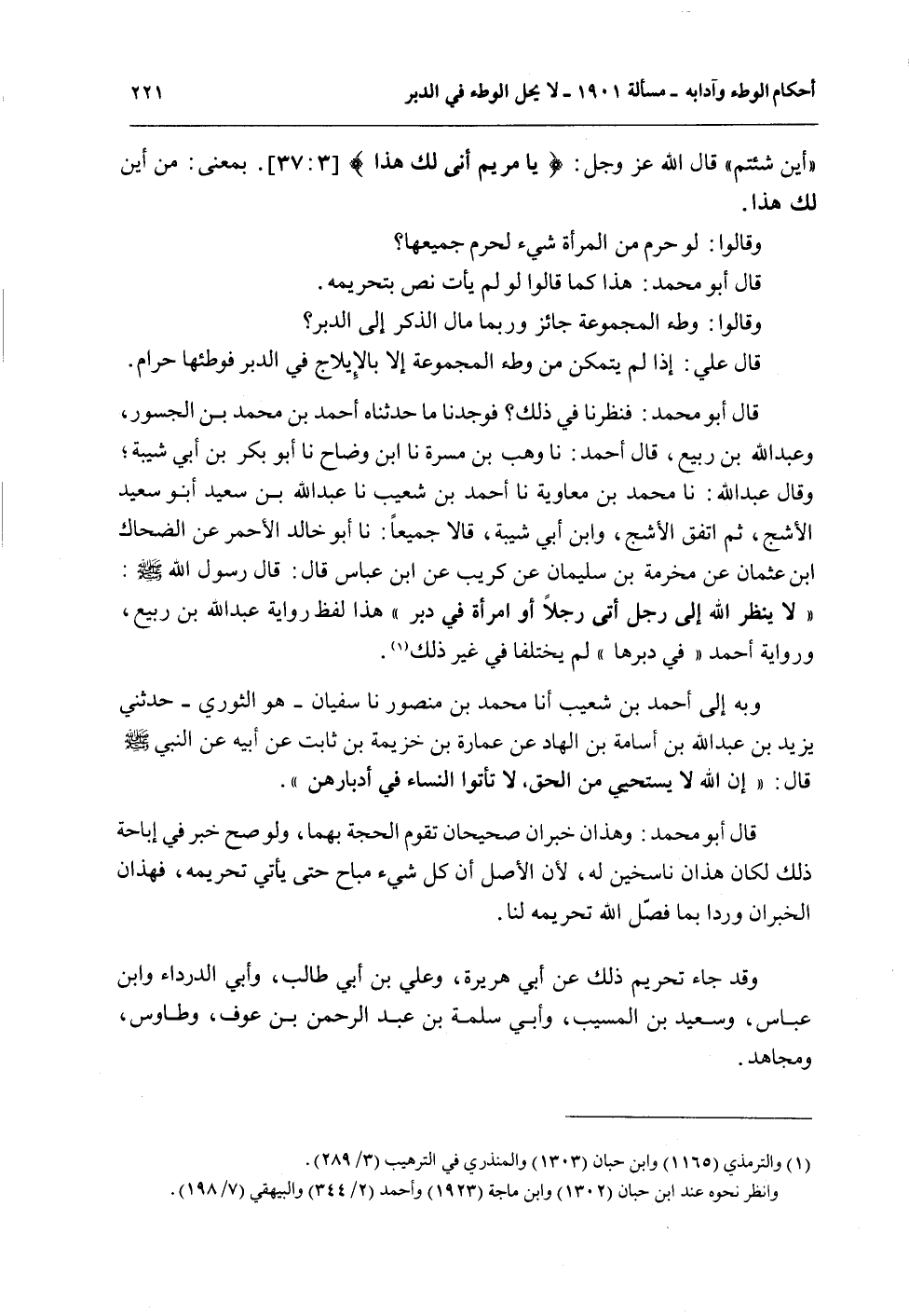 قَالَ أَبُو مُحَمَّدٍ: فَنَظَرْنَا فِي ذَلِكَ؟ فَوَجَدْنَا مَا حَدَّثَنَاهُ أَحْمَدُ بْنُ مُحَمَّدِ بْنِ الْجَسُورِ، وَعَبْدُ اللَّهِ بْنُ رَبِيعٍ، قَالَ أَحْمَدُ: نَا وَهْبُ بْنُ مَسَرَّةَ نا ابْنُ وَضَّاحٍ نا أَبُو بَكْرِ بْنُ أَبِي شَيْبَةَ؛ وَقَالَ عَبْدُ اللَّهِ: نا مُحَمَّدُ بْنُ مُعَاوِيَةَ نا أَحْمَدُ بْنُ شُعَيْبٍ نا عَبْدُ اللَّهِ بْنُ سَعِيدٍ أَبُو سَعِيدٍ الْأَشَجُّ، ثُمَّ اتَّفَقَ الْأَشَجُّ، وَابْنُ أَبِي شَيْبَةَ، قَالَا جَمِيعًا: نا أَبُو خَالِدٍ الْأَحْمَرُ عَنْ الضَّحَّاكِ بْنِ عُثْمَانَ عَنْ مَخْرَمَةَ بْنِ سُلَيْمَانَ عَنْ كُرَيْبٍ عَنْ ابْنِ عَبَّاسٍ قَالَ: قَالَ رَسُولُ اللَّهِ - صَلَّى اللَّهُ عَلَيْهِ وَسَلَّمَ -: «لَا يَنْظُرُ اللَّهُ إلَى رَجُلٍ أَتَى رَجُلًا أَوْ امْرَأَةً فِي دُبُرٍ» هَذَا لَفْظُ وَرِوَايَةُ عَبْدِ اللَّهِ بْنِ رَبِيعٍ، وَرِوَايَةُ أَحْمَدَ " فِي دُبُرِهَا " لَمْ يَخْتَلِفَا فِي غَيْرِ ذَلِكَ