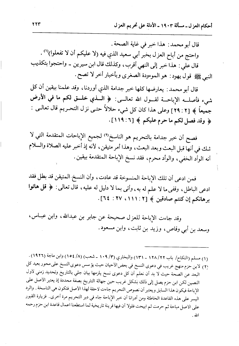 فَصَحَّ أَنَّ خَبَرَ جُدَامَةَ بِالتَّحْرِيمِ هُوَ النَّاسِخُ لِجَمِيعِ الْإِبَاحَاتِ الْمُتَقَدِّمَةِ الَّتِي لَا شَكَّ فِي أَنَّهَا قَبْلَ الْبَعْثِ وَبَعْدَ الْبَعْثِ، وَهَذَا أَمْرٌ مُتَيَقَّنٌ، لِأَنَّهُ أَخْبَرَ - عَلَيْهِ الصَّلَاةُ وَالسَّلَامُ - أَنَّهُ الْوَأْدُ الْخَفِيُّ، وَالْوَأْدُ مُحَرَّمٌ، فَقَدْ نَسَخَ الْإِبَاحَةَ الْمُتَقَدِّمَةَ بِيَقِينٍ.
