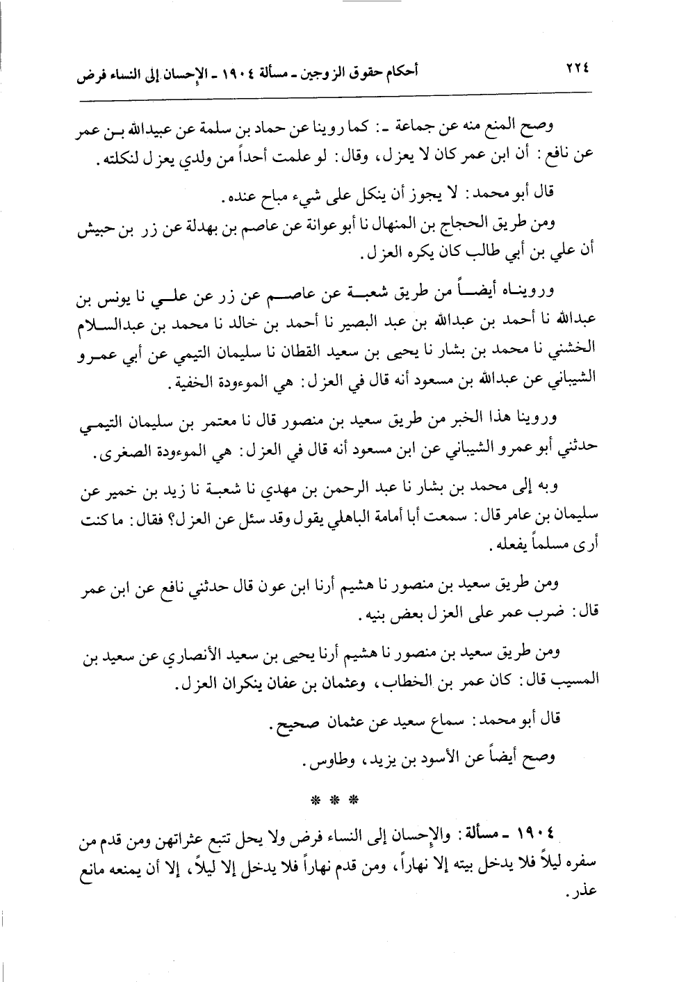 أَحْكَامُ حُقُوقُ الزَّوْجَيْنِ 1904 - مَسْأَلَةٌ: وَالْإِحْسَانُ إلَى النِّسَاءِ فَرْضٌ وَلَا يَحِلُّ تَتَبُّعُ عَثَرَاتِهِنَّ وَمَنْ قَدِمَ مِنْ سَفَرِهِ لَيْلًا فَلَا يَدْخُلُ بَيْتَهُ إلَّا نَهَارًا، وَمَنْ قَدِمَ نَهَارًا فَلَا يَدْخُلُ إلَّا لَيْلًا، إلَّا أَنْ يَمْنَعَهُ مَانِعٌ عُذْرٌ