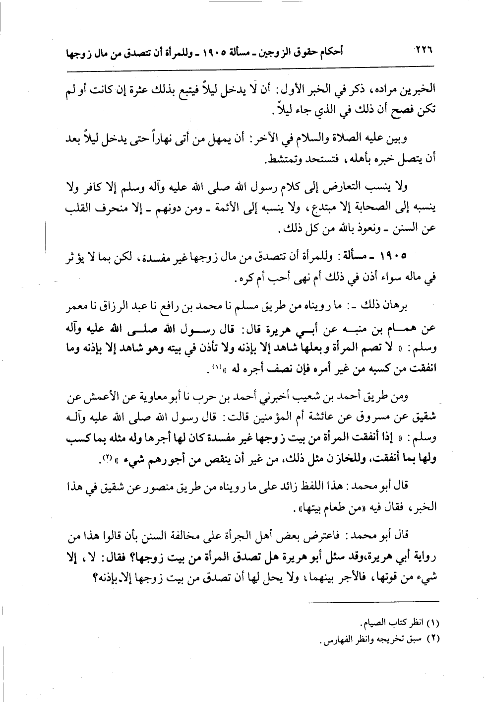 1905 - مَسْأَلَةٌ: وَلِلْمَرْأَةِ أَنْ تَتَصَدَّقَ مِنْ مَالِ زَوْجِهَا غَيْرَ مُفْسِدَةٍ، لَكِنْ بِمَا لَا يُؤَثِّرُ فِي مَالِهِ سَوَاءٌ أَذِنَ فِي ذَلِكَ أَمْ نَهَى أَحَبَّ أَمْ كَرِهَ