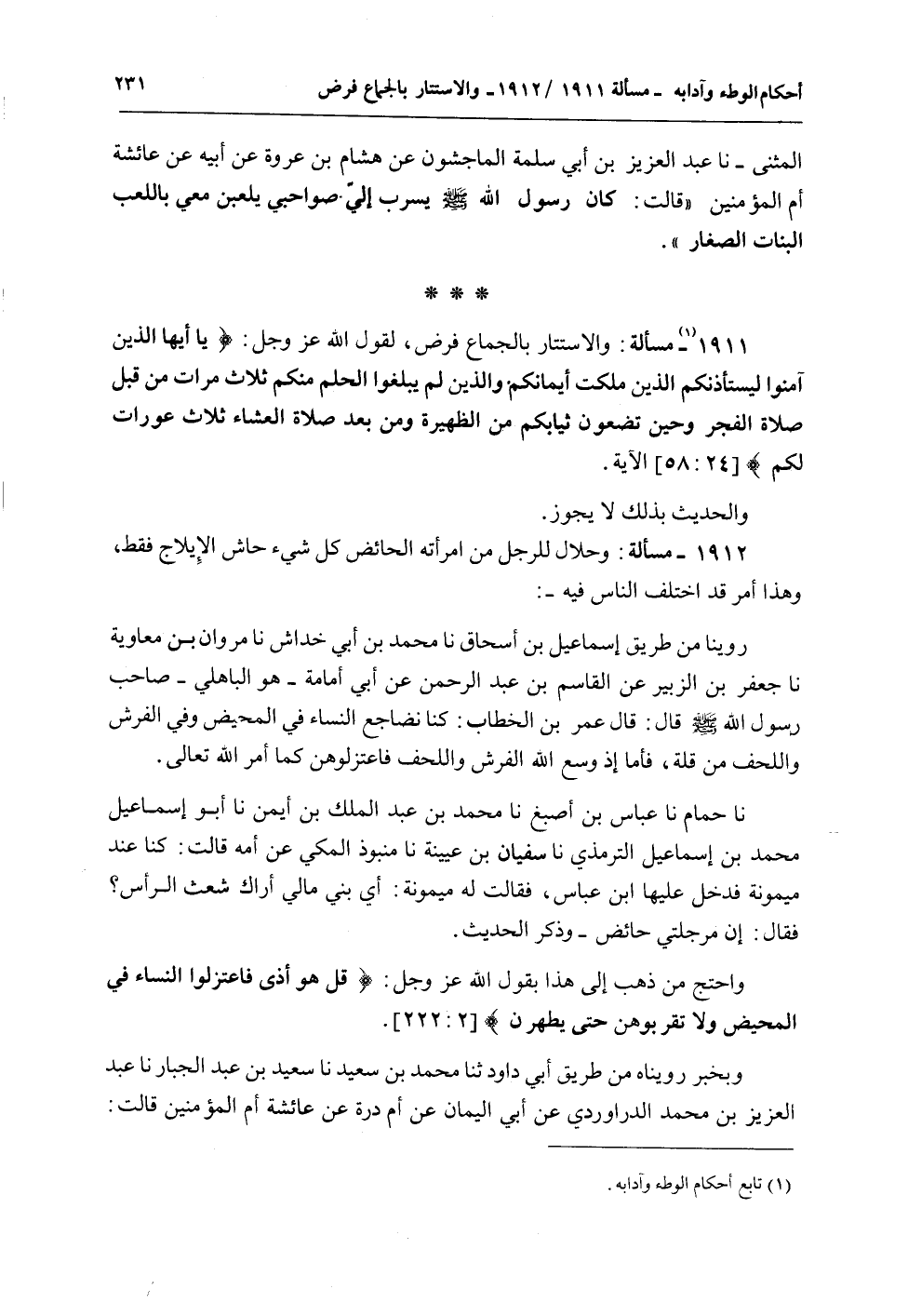1912 - مَسْأَلَةٌ: وَحَلَالٌ لِلرَّجُلِ مِنْ امْرَأَتِهِ الْحَائِضِ كُلَّ شَيْءٍ حَاشَ الْإِيلَاجَ فَقَطْ، وَهَذَا أَمْرٌ قَدْ اخْتَلَفَ النَّاسُ فِيهِ -: رُوِّينَا مِنْ طَرِيقِ إسْمَاعِيلَ بْنِ إِسْحَاقَ نا مُحَمَّدُ بْنُ أَبِي خِدَاشٍ نا مَرْوَانُ بْنُ مُعَاوِيَةَ نا جَعْفَرُ بْنُ الزُّبَيْرِ عَنْ الْقَاسِمِ بْنِ عَبْدِ الرَّحْمَنِ عَنْ أَبِي أُمَامَةَ - وَهُوَ الْبَاهِلِيُّ - صَاحِبُ رَسُولِ اللَّهِ - صَلَّى اللَّهُ عَلَيْهِ وَسَلَّمَ - قَالَ: قَالَ عُمَرُ بْنُ الْخَطَّابِ: كُنَّا نُضَاجِعُ النِّسَاءَ فِي الْمَحِيضِ وَفِي الْفُرُشِ وَاللُّحُفِ مِنْ قِلَّةٍ، فَأَمَّا إذْ وَسَّعَ اللَّهَ الْفُرُشَ وَاللُّحُفَ فَاعْتَزِلُوهُنَّ كَمَا أَمَرَ اللَّهُ تَعَالَى نا حُمَامٌ نا عَبَّاسُ بْنُ أَصْبَغَ نا مُحَمَّدُ بْنُ عَبْدِ الْمَلِكِ بْنِ أَيْمَنَ نا أَبُو إسْمَاعِيلَ مُحَمَّدُ بْنُ إسْمَاعِيلَ التِّرْمِذِيُّ نا سُفْيَانُ بْنُ عُيَيْنَةَ نا مَنْبُوذٌ الْمَكِّيُّ عَنْ أُمِّهِ قَالَتْ: كُنَّا عِنْدَ مَيْمُونَةَ فَدَخَلَ عَلَيْهَا ابْنُ عَبَّاسٍ، فَقَالَتْ لَهُ مَيْمُونَةُ: أَيْ بُنَيَّ مَا لِي أَرَاك شَعِثَ الرَّأْسِ؟ فَقَالَ: إنَّ مُرَجِّلَتِي حَائِضٌ - وَذَكَرَ الْحَدِيثَ.