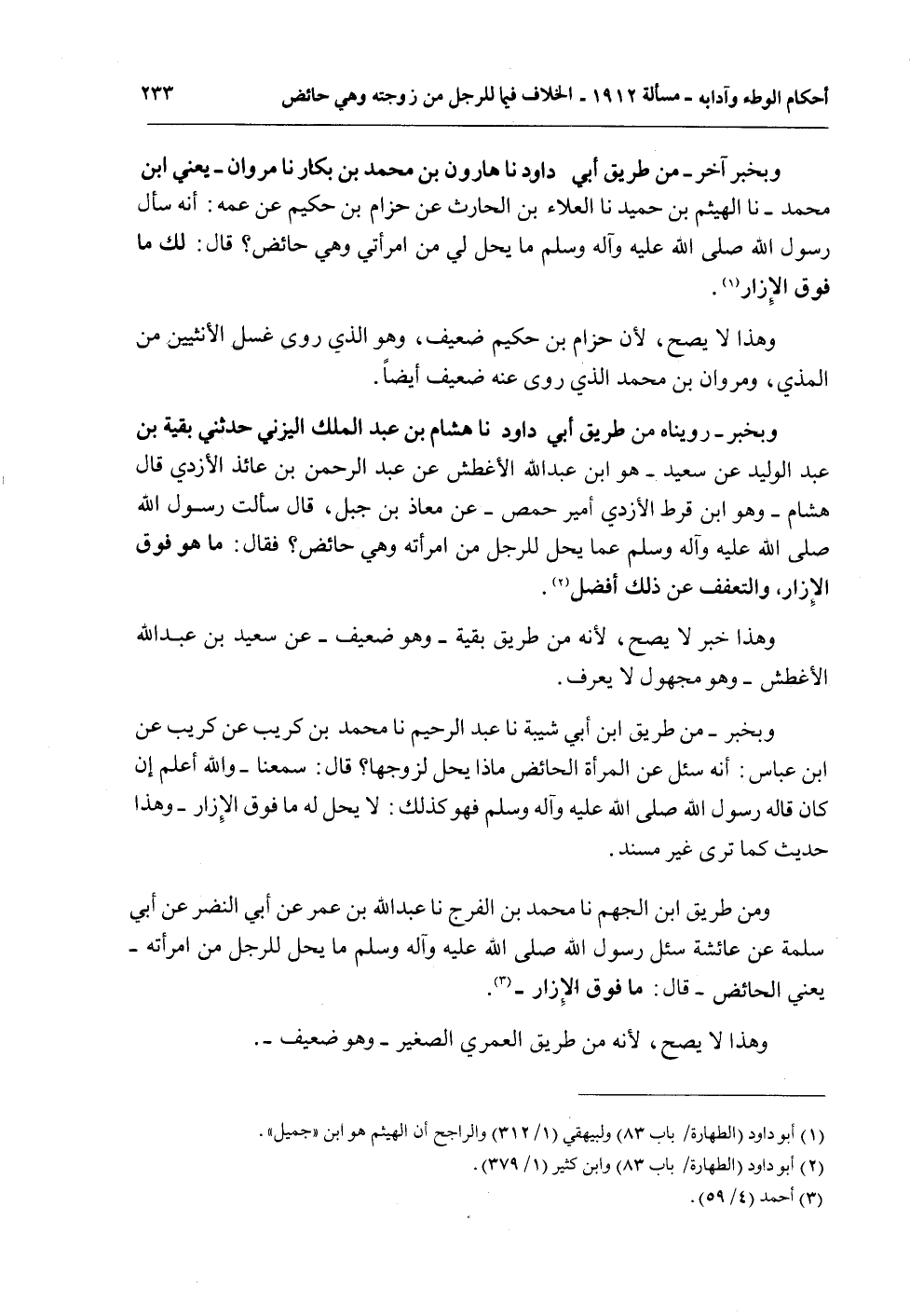 وَبِخَبَرٍ - رُوِّينَاهُ مِنْ طَرِيقِ أَبِي دَاوُد نا هِشَامُ بْنُ عَبْدِ الْمَلِكِ الْيَزَنِيُّ حَدَّثَنِي بَقِيَّةُ بْنُ عَبْدِ الْوَلِيدِ عَنْ سَعِيدٍ - هُوَ ابْنُ عَبْدِ اللَّهِ الْأَغْطَشُ عَنْ عَبْدِ الرَّحْمَنِ بْنِ عَائِذٍ الْأَزْدِيُّ قَالَ هِشَامٌ - وَهُوَ ابْنُ قِرْطٍ الْأَزْدِيُّ أَمِيرُ حِمْصَ - عَنْ مُعَاذِ بْنِ جَبَلٍ، قَالَ: «سَأَلْتُ رَسُولَ اللَّهِ - صَلَّى اللَّهُ عَلَيْهِ وَآلِهِ وَسَلَّمَ - عَمَّا يَحِلُّ لِلرَّجُلِ مِنْ امْرَأَتِهِ وَهِيَ حَائِضٌ؟ فَقَالَ: مَا هُوَ فَوْقَ الْإِزَارِ، وَالتَّعَفُّفُ عَنْ ذَلِكَ أَفْضَلُ»