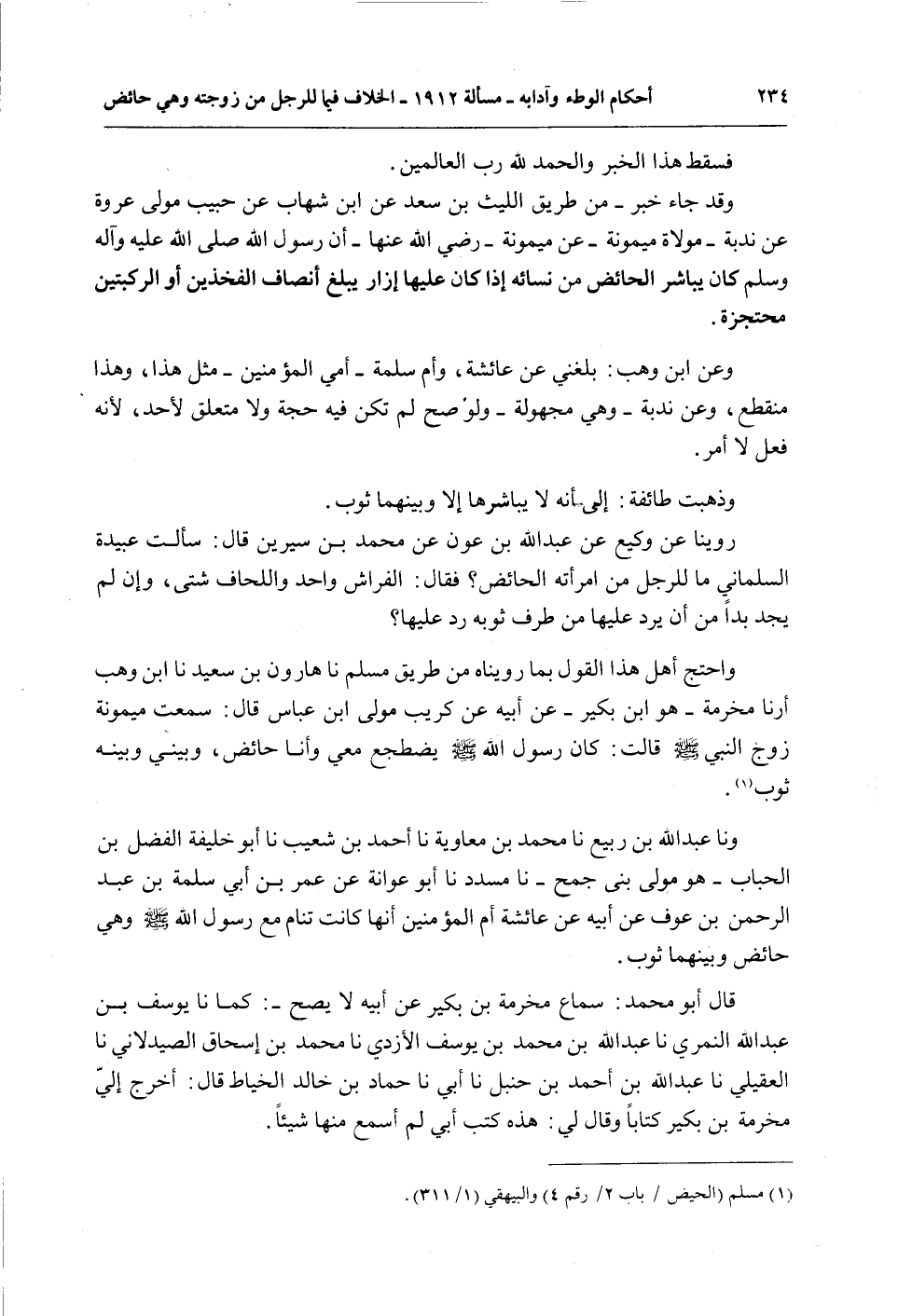 رُوِّينَا عَنْ وَكِيعٍ عَنْ عَبْدِ اللَّهِ بْنِ عَوْنٍ عَنْ مُحَمَّدِ بْنِ سِيرِينَ قَالَ: سَأَلْت عَبِيدَةُ السَّلْمَانِيَّ مَا لِلرَّجُلِ مِنْ امْرَأَتِهِ الْحَائِضِ؟ فَقَالَ: الْفِرَاشُ وَاحِدٌ وَاللِّحَافُ شَتَّى، وَإِنْ لَمْ يَجِدْ بُدًّا مِنْ أَنْ يَرُدَّ عَلَيْهَا مِنْ طَرَفِ ثَوْبِهِ رَدَّ عَلَيْهَا؟ وَاحْتَجَّ أَهْلُ هَذَا الْقَوْلِ بِمَا رُوِّينَاهُ مِنْ طَرِيقِ مُسْلِمٍ نا هَارُونُ بْنُ سَعِيدٍ نا ابْنُ وَهْبٍ نا مَخْرَمَةُ - هُوَ ابْنُ بُكَيْرٍ - عَنْ أَبِيهِ عَنْ كُرَيْبٍ مَوْلَى ابْنِ عَبَّاسٍ قَالَ: «سَمِعْتُ مَيْمُونَةَ زَوْجَ النَّبِيِّ - صَلَّى اللَّهُ عَلَيْهِ وَسَلَّمَ - قَالَتْ: كَانَ رَسُولُ اللَّهِ - صَلَّى اللَّهُ عَلَيْهِ وَسَلَّمَ - يَضْطَجِعُ مَعِي وَأَنَا حَائِضٌ، وَبَيْنِي وَبَيْنَهُ ثَوْبٌ» .