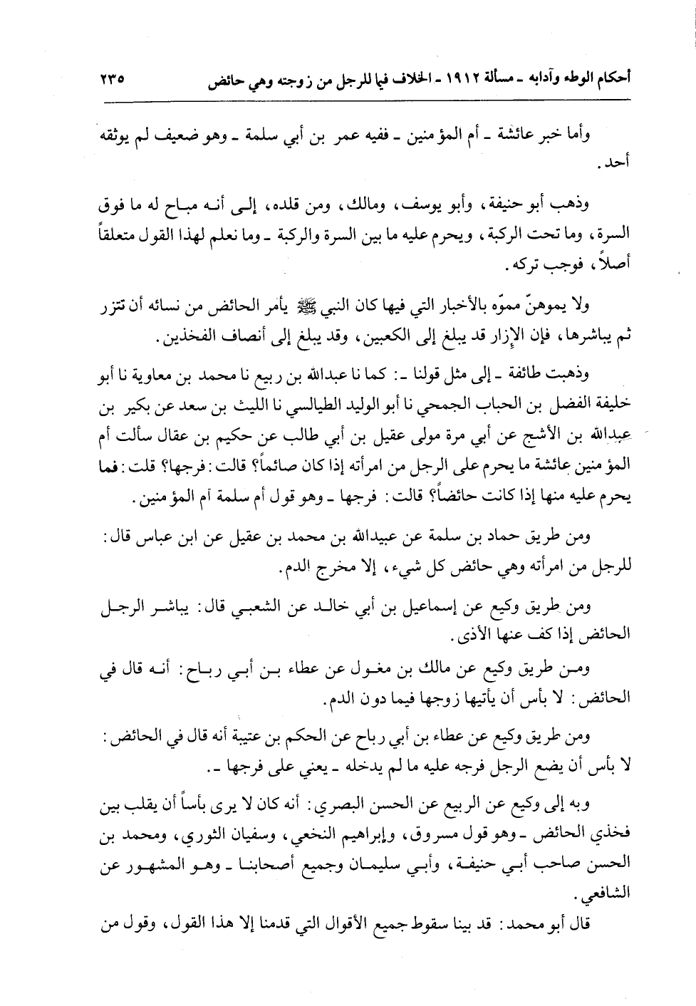 وَبِهِ إلَى وَكِيعٍ عَنْ الرَّبِيعِ عَنْ الْحَسَنِ الْبَصْرِيِّ: أَنَّهُ كَانَ لَا يَرَى بَأْسًا أَنْ يُقَلِّبَ بَيْنَ فَخِذَيْ الْحَائِضِ - وَهُوَ قَوْلُ مَسْرُوقٍ، وَإِبْرَاهِيمَ النَّخَعِيِّ، وَسُفْيَانَ الثَّوْرِيِّ، وَمُحَمَّدِ بْنِ الْحَسَنِ صَاحِبِ أَبِي حَنِيفَةَ، وَأَبِي سُلَيْمَانَ وَجَمِيعِ أَصْحَابِنَا - وَهُوَ الْمَشْهُورُ عَنْ الشَّافِعِيِّ.