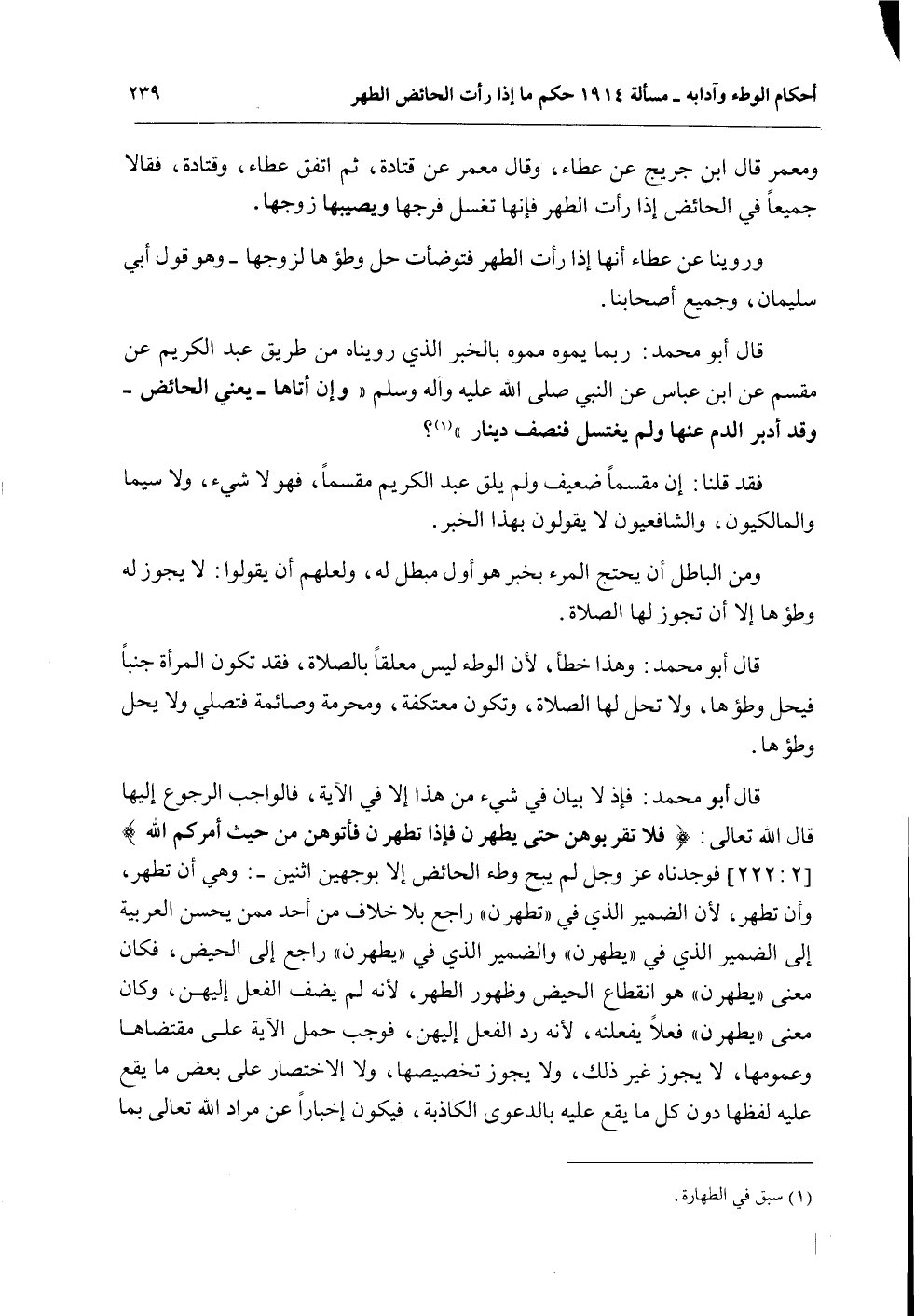 قَالَ أَبُو مُحَمَّدٍ: فَإِذْ لَا بَيَانَ فِي شَيْءٍ مِنْ هَذَا إلَّا فِي الْآيَةِ، فَالْوَاجِبُ الرُّجُوعُ إلَيْهَا قَالَ اللَّهُ تَعَالَى: {وَلا تَقْرَبُوهُنَّ حَتَّى يَطْهُرْنَ فَإِذَا تَطَهَّرْنَ فَأْتُوهُنَّ مِنْ حَيْثُ أَمَرَكُمُ اللَّهُ} [البقرة: 222] فَوَجَدْنَاهُ عَزَّ وَجَلَّ لَمْ يُبِحْ وَطْءَ الْحَائِضِ إلَّا بِوَجْهَيْنِ اثْنَيْنِ -: وَهِيَ أَنْ تَطْهُرَ، وَأَنْ تَطْهُرَ، لِأَنَّ الضَّمِيرَ الَّذِي فِي " تَطَهَّرْنَ " رَاجِعٌ بِلَا خِلَافٍ مِنْ أَحَدٍ مِمَّنْ يُحْسِنُ الْعَرَبِيَّةَ إلَى الضَّمِيرِ الَّذِي فِي " يَطْهُرْنَ " وَالضَّمِيرُ الَّذِي فِي " يَطْهُرْنَ " رَاجِعٌ إلَى الْحَيْضِ، فَكَانَ مَعْنَى " يَطْهُرْنَ " هُوَ انْقِطَاعُ الْحَيْضِ وَظُهُورُ الطُّهْرِ، لِأَنَّهُ لَمْ يُضِفْ الْفِعْلَ إلَيْهِنَّ، وَكَانَ مَعْنَى " يَطْهُرْنَ " فِعْلًا يَفْعَلْنَهُ، لِأَنَّهُ رَدَّ الْفِعْلَ إلَيْهِنَّ، فَوَجَبَ حَمْلُ الْآيَةِ عَلَى مُقْتَضَاهَا وَعُمُومِهَا، لَا يَجُوزُ غَيْرُ ذَلِكَ، وَلَا يَجُوزُ تَخْصِيصُهَا، وَلَا الِاخْتِصَارُ عَلَى بَعْضِ مَا يَقَعُ عَلَيْهِ لَفْظُهَا دُونَ كُلِّ مَا يَقَعُ عَلَيْهِ بِالدَّعْوَى الْكَاذِبَةِ، فَيَكُونُ إخْبَارًا عَنْ مُرَادِ اللَّهِ تَعَالَى بِمَا