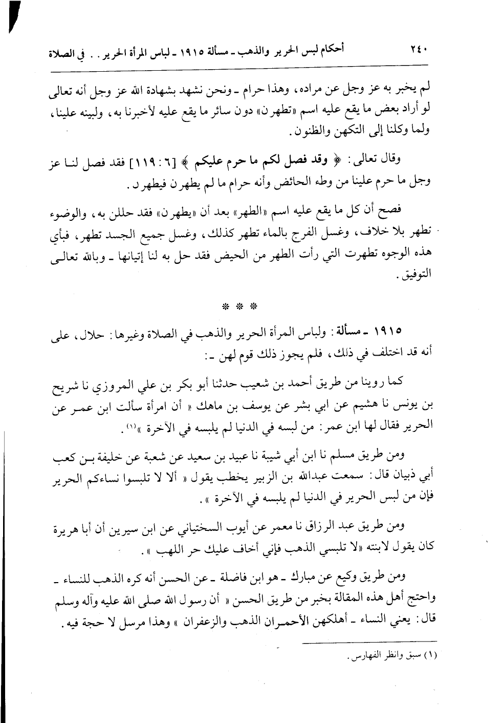 أَحْكَامُ لِبْسُ الْحَرِير وَالذَّهَب 1915 - مَسْأَلَةٌ: وَلِبَاسُ الْمَرْأَةِ الْحَرِيرَ وَالذَّهَبَ فِي الصَّلَاةِ وَغَيْرِهَا: حَلَالٌ، عَلَى أَنَّهُ قَدْ اُخْتُلِفَ فِي ذَلِكَ، فَلَمْ يُجِزْ ذَلِكَ قَوْمٌ لَهُنَّ -: كَمَا رُوِّينَا مِنْ طَرِيقِ أَحْمَدَ بْنِ شُعَيْبٍ حَدَّثَنَا أَبُو بَكْرِ بْنُ عَلِيٍّ الْمَرْوَزِيِّ نا شُرَيْحُ بْنُ يُونُسَ نا هُشَيْمٌ عَنْ أَبِي بِشْرٍ عَنْ يُوسُفَ بْنِ مَاهَكَ " أَنَّ امْرَأَةً سَأَلَتْ ابْنَ عُمَرَ عَنْ الْحَرِيرِ فَقَالَ لَهَا ابْنُ عُمَرَ: مَنْ لَبِسَهُ فِي الدُّنْيَا لَمْ يَلْبَسْهُ فِي الْآخِرَةِ ".