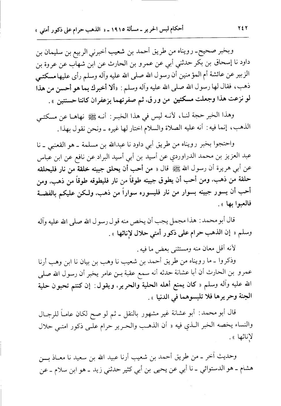 وَاحْتَجُّوا بِخَبَرٍ رُوِّينَاهُ مِنْ طَرِيقِ أَبِي دَاوُد نا عَبْدُ اللَّهِ بْنُ مَسْلَمَةَ - هُوَ الْقَعْنَبِيُّ - نا عَبْدُ الْعَزِيزِ بْنُ مُحَمَّدٍ الدَّرَاوَرْدِيُّ عَنْ أُسَيْدَ بْنِ أَبِي أُسَيْدَ الْبَرَّادِ عَنْ نَافِعٍ عَنْ ابْنِ عَبَّاسٍ عَنْ أَبِي هُرَيْرَةَ أَنَّ رَسُولَ اللَّهِ - صَلَّى اللَّهُ عَلَيْهِ وَسَلَّمَ - قَالَ «مَنْ أَحَبَّ أَنْ يُحَلِّقَ جَبِينَهُ حَلْقَةً مِنْ نَارٍ فَلْيُحَلِّقْهُ حَلْقَةً مِنْ ذَهَبٍ، وَمَنْ أَحَبَّ أَنْ يُطَوِّقَ جَبِينَهُ طَوْقًا مِنْ نَارٍ فَلْيُطَوِّقْهُ طَوْقًا مِنْ ذَهَبٍ، وَمَنْ أَحَبَّ أَنْ يُسَوِّرَ جَبِينَهُ بِسِوَارٍ مِنْ نَارٍ فَلْيُسَوِّرْهُ سِوَارًا مِنْ ذَهَبٍ وَلَكِنْ عَلَيْكُمْ بِالْفِضَّةِ فَالْعَبُوا بِهَا» .