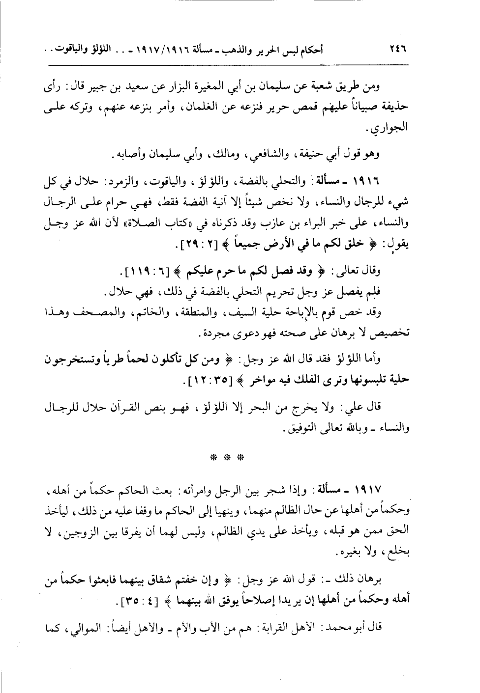 قَالَ عَلِيٌّ: وَلَا يَخْرُجُ مِنْ الْبَحْرِ إلَّا اللُّؤْلُؤُ، فَهُوَ بِنَصِّ الْقُرْآنِ حَلَالٌ لِلرِّجَالِ وَالنِّسَاءِ - وَبِاَللَّهِ تَعَالَى التَّوْفِيقُ
