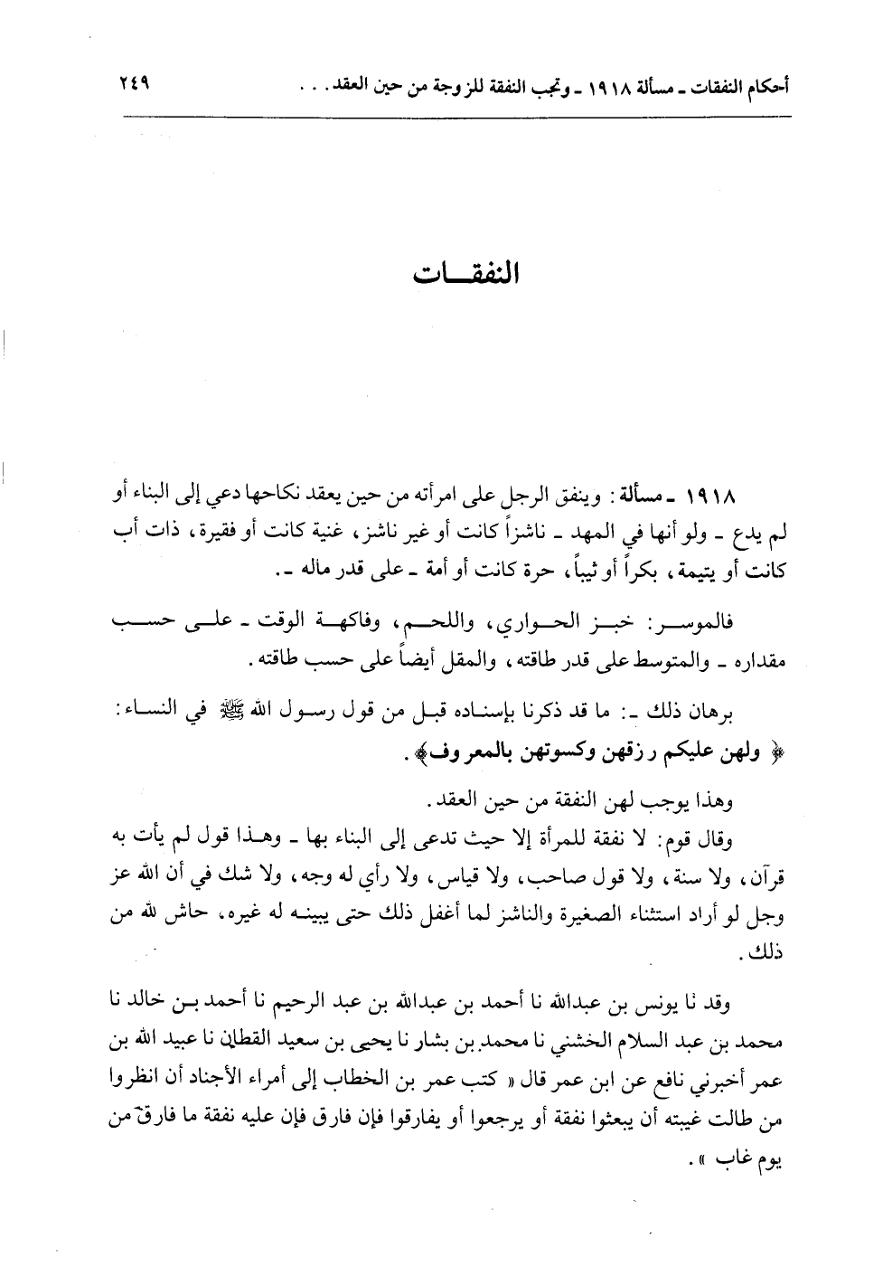 وَقَدْ نا يُونُسُ بْنُ عَبْدِ اللَّهِ نا أَحْمَدُ بْنُ عَبْدِ اللَّهِ بْنِ عَبْدِ الرَّحِيمِ نَا أَحْمَدُ بْنُ خَالِدٍ نا مُحَمَّدُ بْنُ عَبْدِ السَّلَامِ الْخُشَنِيُّ نا مُحَمَّدُ بْنُ بَشَّارٍ نا يَحْيَى بْنُ سَعِيدٍ الْقَطَّانُ نا عُبَيْدُ اللَّهِ بْنُ عُمَرَ أَخْبَرَنِي نَافِعٌ عَنْ ابْنِ عُمَرَ قَالَ " كَتَبَ عُمَرُ بْنُ الْخَطَّابِ إلَى أُمَرَاءِ الْأَجْنَادِ أَنْ اُنْظُرُوا مَنْ طَالَتْ غِيبَتُهُ أَنْ يَبْعَثُوا نَفَقَةً أَوْ يَرْجِعُوا أَوْ يُفَارِقُوا فَإِنْ فَارَقَ فَإِنَّ عَلَيْهِ نَفَقَةَ مَا فَارَقَ مِنْ يَوْمٍ غَابَ "