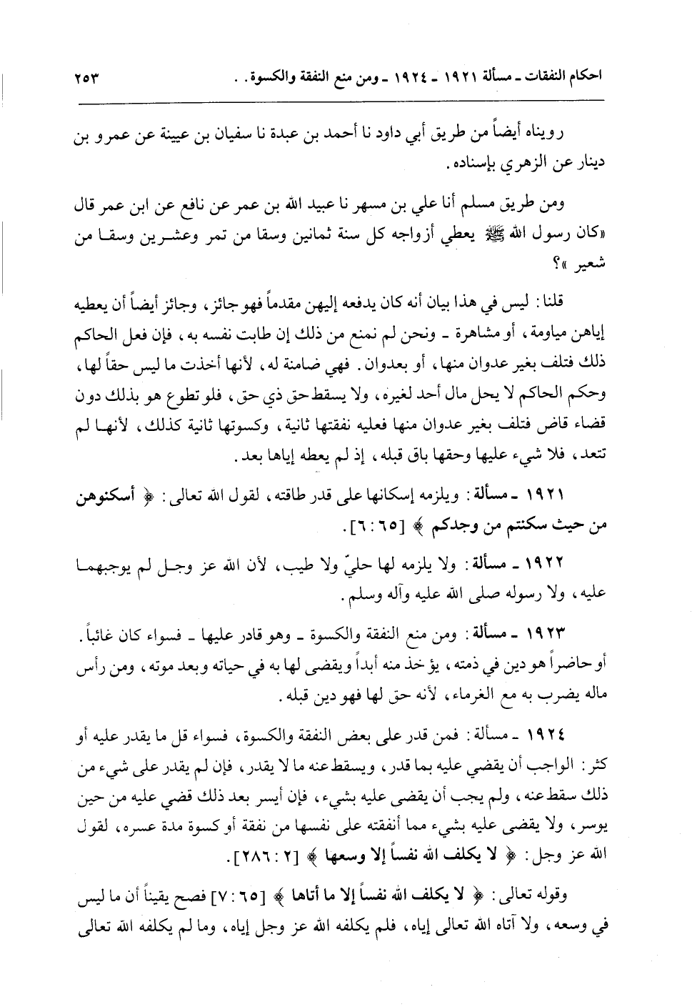 وَمِنْ طَرِيقِ مُسْلِمٍ أَنَا عَلِيُّ بْنُ مُسْهِرٍ نا عُبَيْدُ اللَّهِ بْنُ عُمَرَ عَنْ نَافِعٍ عَنْ ابْنِ عُمَرَ قَالَ «كَانَ رَسُولُ اللَّهِ - صَلَّى اللَّهُ عَلَيْهِ وَسَلَّمَ - يُعْطِي أَزْوَاجَهُ كُلَّ سَنَةٍ ثَمَانِينَ وَسْقًا مِنْ تَمْرٍ وَعِشْرِينَ وَسْقًا مِنْ شَعِيرٍ» ؟ قُلْنَا: لَيْسَ فِي هَذَا بَيَانٌ أَنَّهُ كَانَ يَدْفَعُهُ إلَيْهِنَّ مُقَدَّمًا فَهُوَ جَائِزٌ، وَجَائِزٌ أَيْضًا أَنْ يُعْطِيَهُ إيَّاهُنَّ مُيَاوَمَةً، أَوْ مُشَاهَرَةً - وَنَحْنُ لَمْ نَمْنَعْ مِنْ ذَلِكَ إنْ طَابَتْ نَفْسُهُ بِهِ، فَإِنْ فَعَلَ الْحَاكِمُ ذَلِكَ فَتَلِفَ بِغَيْرِ عُدْوَانٍ مِنْهَا، أَوْ بِعُدْوَانٍ.