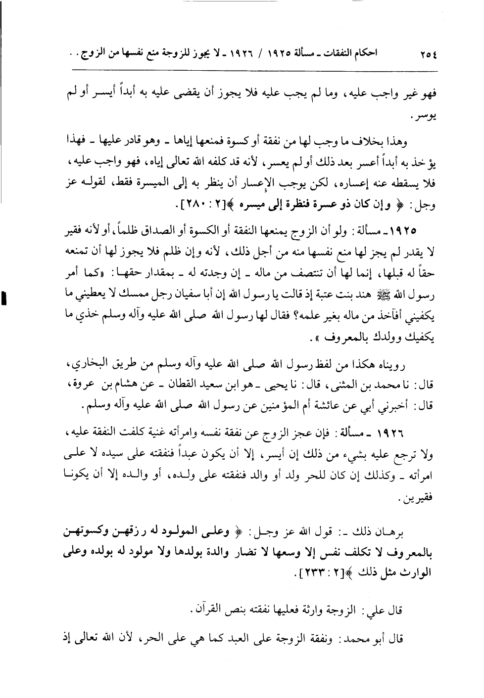 1925 - مَسْأَلَةٌ: وَلَوْ أَنَّ الزَّوْجَ يَمْنَعُهَا النَّفَقَةَ أَوْ الْكِسْوَةَ أَوْ الصَّدَاقَ ظُلْمًا، أَوْ لِأَنَّهُ فَقِيرٌ لَا يَقْدِرُ لَمْ يَجُزْ لَهَا مَنْعُ نَفْسِهَا مِنْهُ مِنْ أَجْلِ ذَلِكَ، لِأَنَّهُ وَإِنْ ظَلَمَ فَلَا يَجُوزُ لَهَا أَنْ تَمْنَعَهُ حَقًّا لَهُ قَبْلَهَا، إنَّمَا لَهَا أَنْ تَنْتَصِفَ مِنْ مَالِهِ - إنْ وَجَدَتْهُ لَهُ - بِمِقْدَارِ حَقِّهَا: «كَمَا أَمَرَ رَسُولُ اللَّهِ - صَلَّى اللَّهُ عَلَيْهِ وَسَلَّمَ - هِنْدَ بِنْتَ عُتْبَةَ إذْ قَالَتْ: يَا رَسُولَ اللَّهِ إنَّ أَبَا سُفْيَانَ رَجُلٌ مُمْسِكٌ لَا يُعْطِينِي مَا يَكْفِينِي أَفَآخُذُ مِنْ مَالِهِ بِغَيْرِ عِلْمِهِ؟ فَقَالَ لَهَا رَسُولُ اللَّهِ - صَلَّى اللَّهُ عَلَيْهِ وَآلِهِ وَسَلَّمَ -: خُذِي مَا يَكْفِيكِ وَوَلَدَكِ بِالْمَعْرُوفِ» .