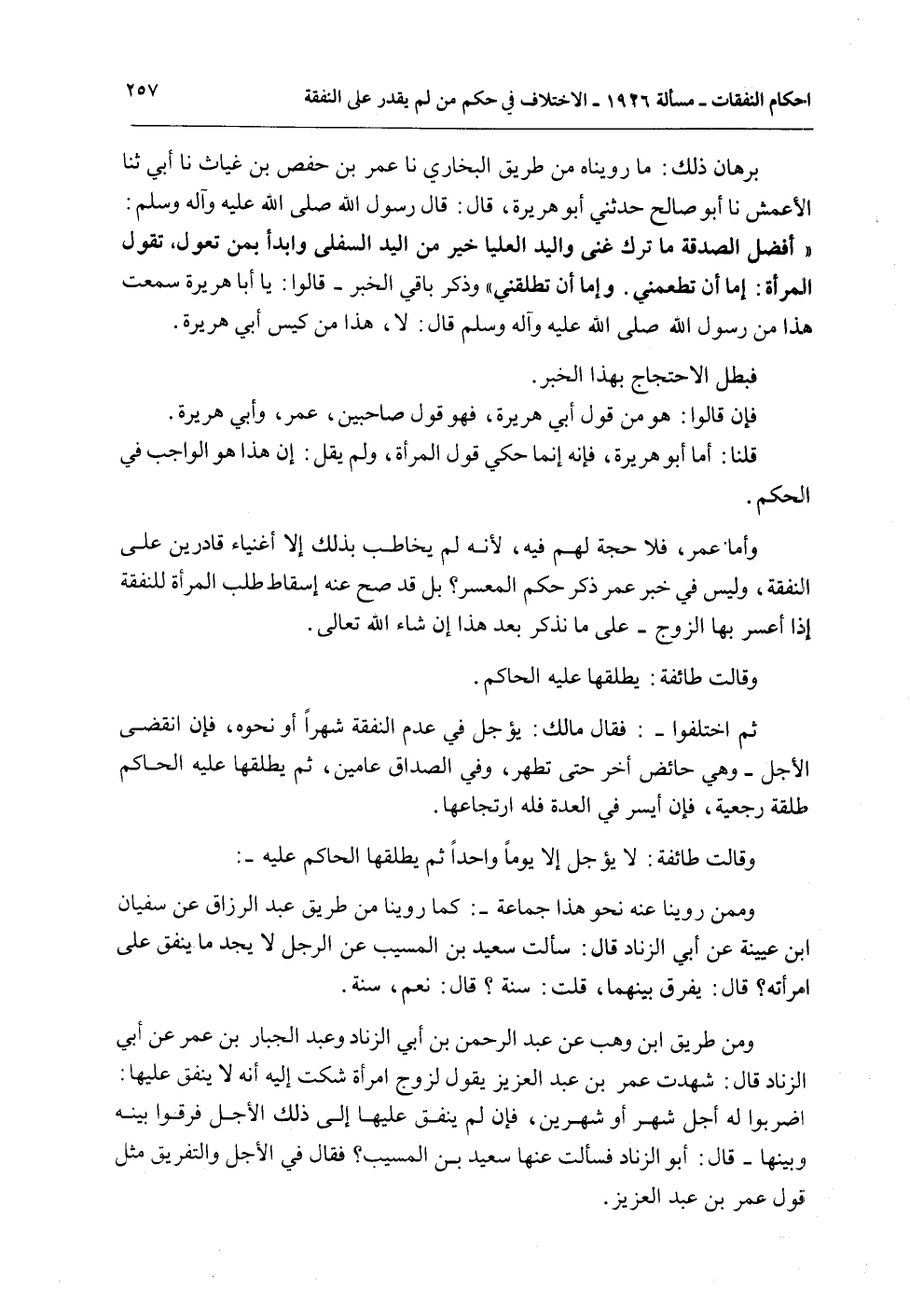 بُرْهَانُ ذَلِكَ: مَا رُوِّينَاهُ مِنْ طَرِيقِ الْبُخَارِيِّ نا عُمَرُ بْنُ حَفْصِ بْنِ غِيَاثٍ نَا أَبِي ثنا الْأَعْمَشُ نا أَبُو صَالِحٍ حَدَّثَنِي أَبُو هُرَيْرَةَ قَالَ: قَالَ رَسُولُ اللَّهِ - صَلَّى اللَّهُ عَلَيْهِ وَآلِهِ وَسَلَّمَ -: «أَفْضَلُ الصَّدَقَةِ مَا تَرَكَ غِنًى وَالْيَدُ الْعُلْيَا خَيْرٌ مِنْ الْيَدِ السُّفْلَى وَابْدَأْ بِمَنْ تَعُولُ» ، تَقُولُ الْمَرْأَةُ: إمَّا أَنْ تُطْعِمَنِي.