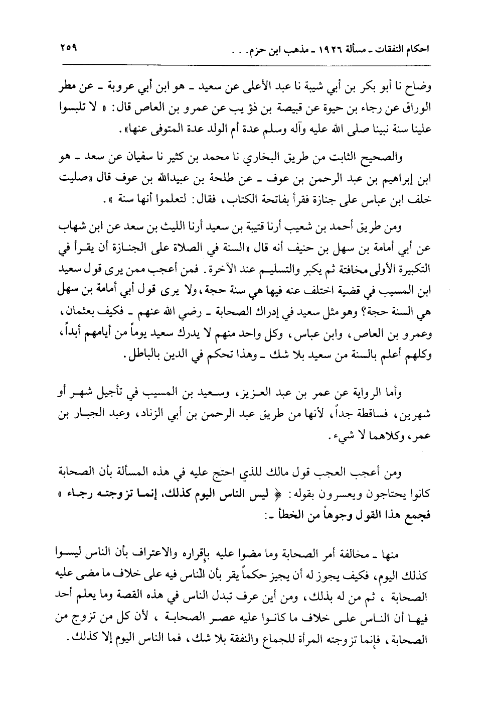 وَمِنْ أَعْجَبِ الْعَجَبِ قَوْلُ مَالِكٍ لِلَّذِي احْتَجَّ عَلَيْهِ فِي هَذِهِ الْمَسْأَلَةِ بِأَنَّ الصَّحَابَةَ كَانُوا يَحْتَاجُونَ وَيُعَسِّرُونَ بِقَوْلِهِ: لَيْسَ النَّاسُ الْيَوْمَ كَذَلِكَ، إنَّمَا تَزَوَّجَتْهُ رَجَاءً " فَجَمَعَ هَذَا الْقَوْلُ وُجُوهًا مِنْ الْخَطَأِ -: مِنْهَا - مُخَالَفَةُ أَمْرِ الصَّحَابَةِ وَمَا مَضَوْا عَلَيْهِ بِإِقْرَارِهِ الِاعْتِرَافَ بِأَنَّ النَّاسَ لَيْسُوا كَذَلِكَ الْيَوْمِ، فَكَيْفُ يَجُوزُ لَهُ أَنْ يُجِيزَ حُكْمًا يُقِرُّ بِأَنَّ النَّاسَ فِيهِ عَلَى خِلَافِ مَا مَضَى عَلَيْهِ الصَّحَابَةُ، ثُمَّ مَنْ لَهُ بِذَلِكَ، وَمِنْ أَيْنَ عَرَفَ تَبَدُّلَ النَّاسِ فِي هَذِهِ الْقِصَّةِ وَمَا يَعْلَمُ أَحَدٌ فِيهَا أَنَّ النَّاسَ عَلَى خِلَافِ مَا كَانُوا عَلَيْهِ عَصْرَ الصَّحَابَةِ، لِأَنَّ كُلَّ مَنْ تَزَوَّجَ مِنْ الصَّحَابَةِ، فَإِنَّمَا تَزَوَّجَتْهُ الْمَرْأَةُ لِلْجِمَاعِ وَالنَّفَقَةِ بِلَا شَكٍّ، فَمَا النَّاسُ الْيَوْمَ إلَّا كَذَلِكَ.