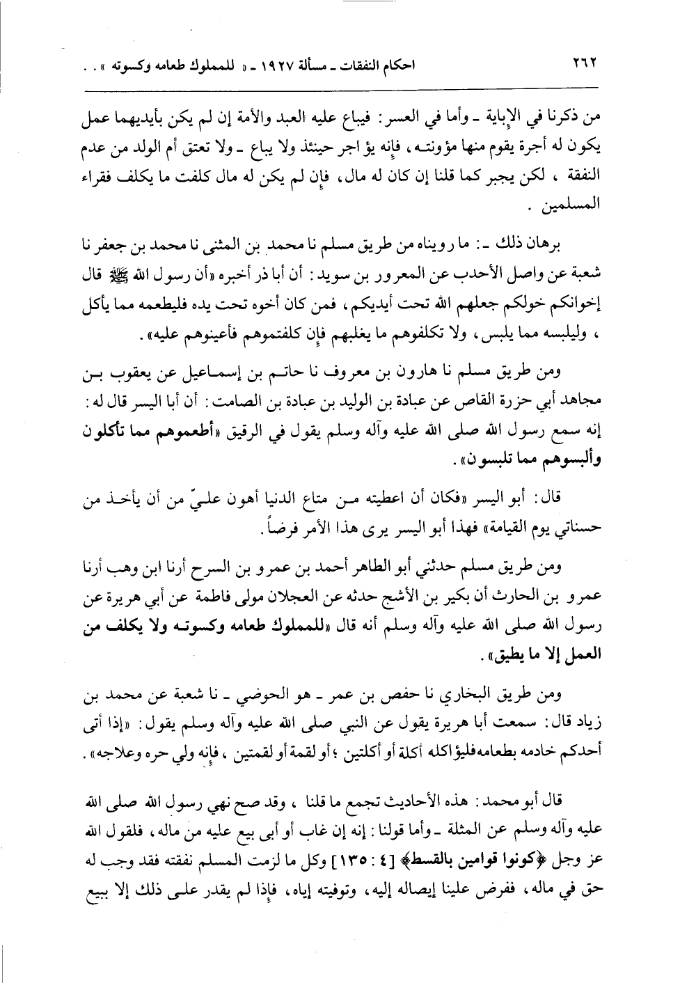 بُرْهَانُ ذَلِكَ -: مَا رُوِّينَاهُ مِنْ طَرِيقِ مُسْلِمٍ نا مُحَمَّدُ بْنُ الْمُثَنَّى نا مُحَمَّدُ بْنُ جَعْفَرٍ نا شُعْبَةُ عَنْ وَاصِلٍ الْأَحْدَبِ عَنْ الْمَعْرُورِ بْنِ سُوَيْدٍ: أَنَّ أَبَا ذَرٍّ أَخْبَرَهُ أَنَّ رَسُولَ اللَّهِ - صَلَّى اللَّهُ عَلَيْهِ وَسَلَّمَ - قَالَ: «إخْوَانُكُمْ خَوَلُكُمْ جَعَلَهُمْ اللَّهُ تَحْتَ أَيْدِيكُمْ، فَمَنْ كَانَ أَخُوهُ تَحْتَ يَدِهِ فَلْيُطْعِمْهُ مِمَّا يَأْكُلُ، وَلْيُلْبِسْهُ مِمَّا يَلْبِسُ، وَلَا تُكَلِّفُوهُمْ مَا يَغْلِبُهُمْ فَإِنْ كَلَّفْتُمُوهُمْ فَأَعِينُوهُمْ عَلَيْهِ» .
