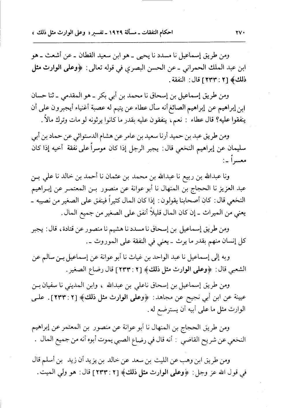 وَمِنْ طَرِيقِ إسْمَاعِيلَ بْنِ إِسْحَاقَ نا مُسَدَّدٌ نا هُشَيْمٌ نا مَنْصُورٌ عَنْ قَتَادَةَ، قَالَ: يُجْبَرُ كُلُّ إنْسَانٍ مِنْهُمْ بِقَدْرِ مَا يَرِثُ - يَعْنِي فِي النَّفَقَةِ عَلَى الْمَوْرُوثِ -.
