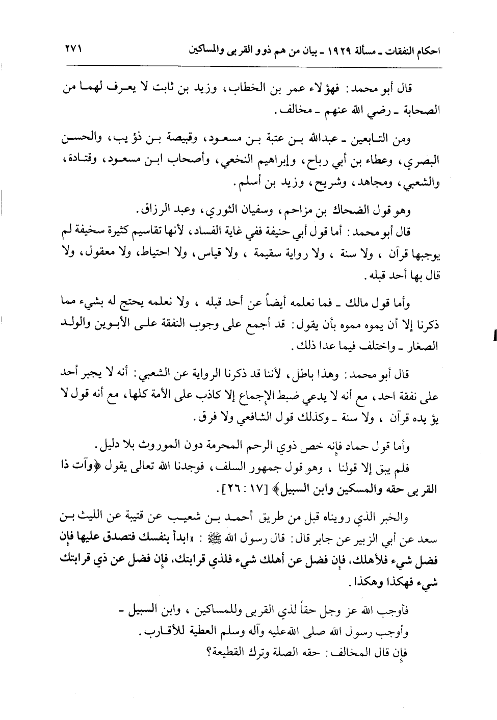 فَلَمْ يَبْقَ إلَّا قَوْلُنَا، وَهُوَ قَوْلُ جُمْهُورِ السَّلَفِ، فَوَجَدْنَا اللَّهَ تَعَالَى يَقُولُ {وَآتِ ذَا الْقُرْبَى حَقَّهُ وَالْمِسْكِينَ وَابْنَ السَّبِيلِ} [الإسراء: 26] .