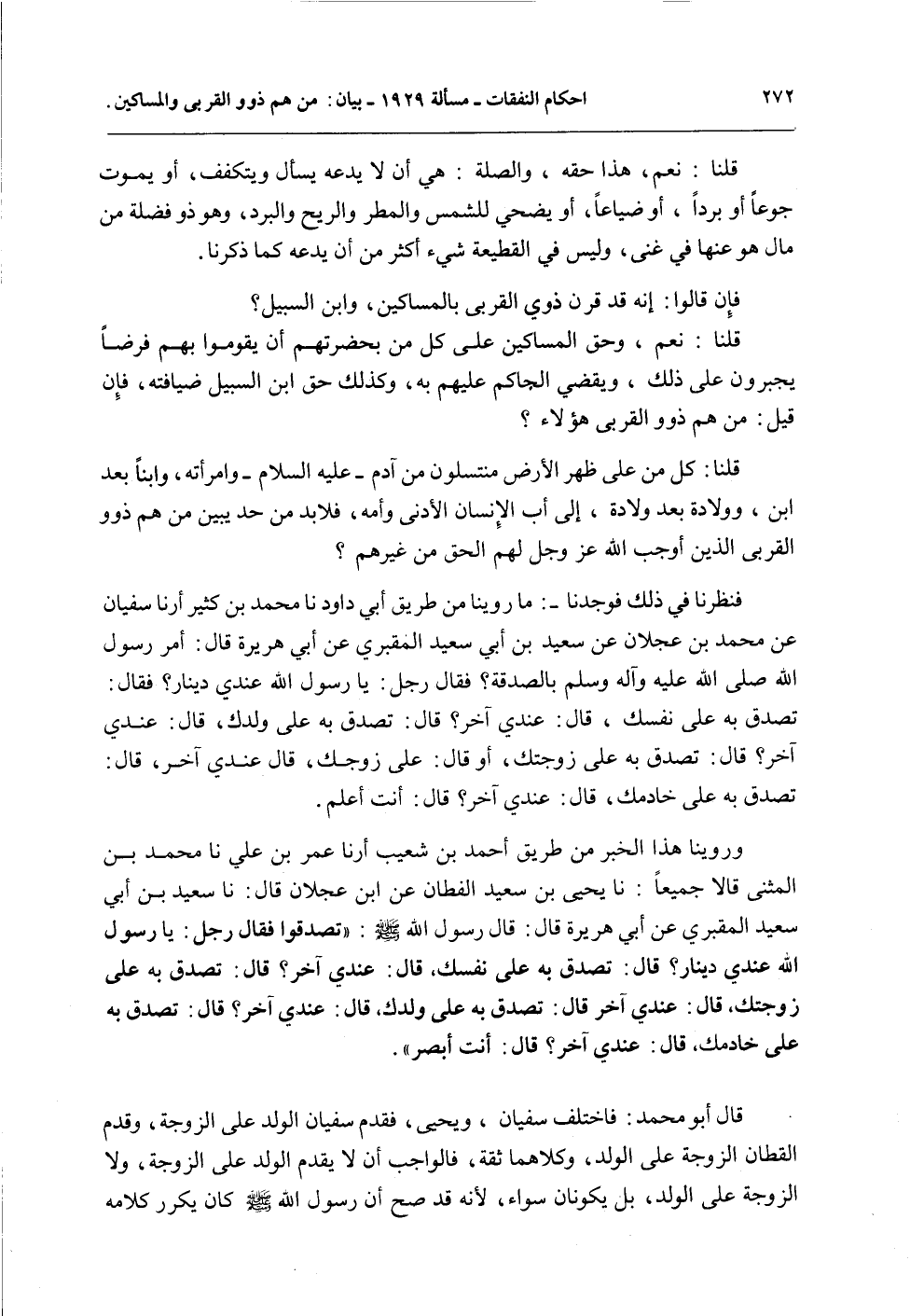 فَإِنْ قَالُوا: إنَّهُ قَدْ قَرَنَ ذَوِي الْقُرْبَى بِالْمَسَاكِينِ، وَابْنِ السَّبِيلِ؟ قُلْنَا: نَعَمْ، وَحَقُّ الْمَسَاكِينِ عَلَى كُلِّ مَنْ بِحَضْرَتِهِمْ أَنْ يَقُومُوا بِهِمْ فَرْضًا يُجْبَرُونَ عَلَى ذَلِكَ، وَيَقْضِي الْحَاكِمُ عَلَيْهِمْ بِهِ، وَكَذَلِكَ حَقُّ ابْنِ السَّبِيلِ ضِيَافَتُهُ، فَإِنْ قِيلَ: مَنْ هُمْ ذَوُو الْقُرْبَى هَؤُلَاءِ؟ قُلْنَا: كُلُّ مَنْ عَلَى ظَهْرِ الْأَرْضِ مُنْتَسِلُونَ مِنْ آدَمَ - عَلَيْهِ السَّلَامُ - وَامْرَأَتِهِ، وَابْنًا بَعْدَ ابْنٍ، وَوِلَادَةً بَعْدَ وِلَادَةٍ، إلَى أَبِ الْإِنْسَانِ الْأَدْنَى وَأُمِّهِ، فَلَا بُدَّ مِنْ حَدٍّ يُبَيِّنُ مَنْ هُمْ ذَوُو الْقُرْبَى الَّذِينَ أَوْجَبَ اللَّهُ عَزَّ وَجَلَّ لَهُمْ الْحَقَّ مِنْ غَيْرِهِمْ؟ فَنَظَرْنَا فِي ذَلِكَ فَوَجَدْنَا -: مَا رُوِّينَا مِنْ طَرِيقِ أَبِي دَاوُد نا مُحَمَّدُ بْنُ كَثِيرٍ أرنا سُفْيَانُ عَنْ مُحَمَّدِ بْنِ عَجْلَانَ عَنْ سَعِيدِ بْنِ أَبِي سَعِيدٍ الْمَقْبُرِيِّ عَنْ أَبِي هُرَيْرَةَ قَالَ: «أَمَرَ رَسُولُ اللَّهِ - صَلَّى اللَّهُ عَلَيْهِ وَآلِهِ وَسَلَّمَ - بِالصَّدَقَةِ؟ فَقَالَ رَجُلٌ: يَا رَسُولَ اللَّهِ عِنْدِي دِينَارٌ؟ فَقَالَ: تَصَدَّقْ بِهِ عَلَى نَفْسِكَ، قَالَ: عِنْدِي آخَرُ؟ قَالَ: تَصَدَّقْ بِهِ عَلَى وَلَدِكَ، قَالَ: عِنْدِي آخَرُ؟ قَالَ: تَصَدَّقُ بِهِ عَلَى زَوْجَتِكَ، أَوْ قَالَ: عَلَى زَوْجِكَ، قَالَ عِنْدِي آخَرُ، قَالَ: تَصَدَّقْ بِهِ عَلَى خَادِمِكَ، قَالَ: عِنْدِي آخَرُ؟ قَالَ: أَنْتَ أَعْلَمُ» .