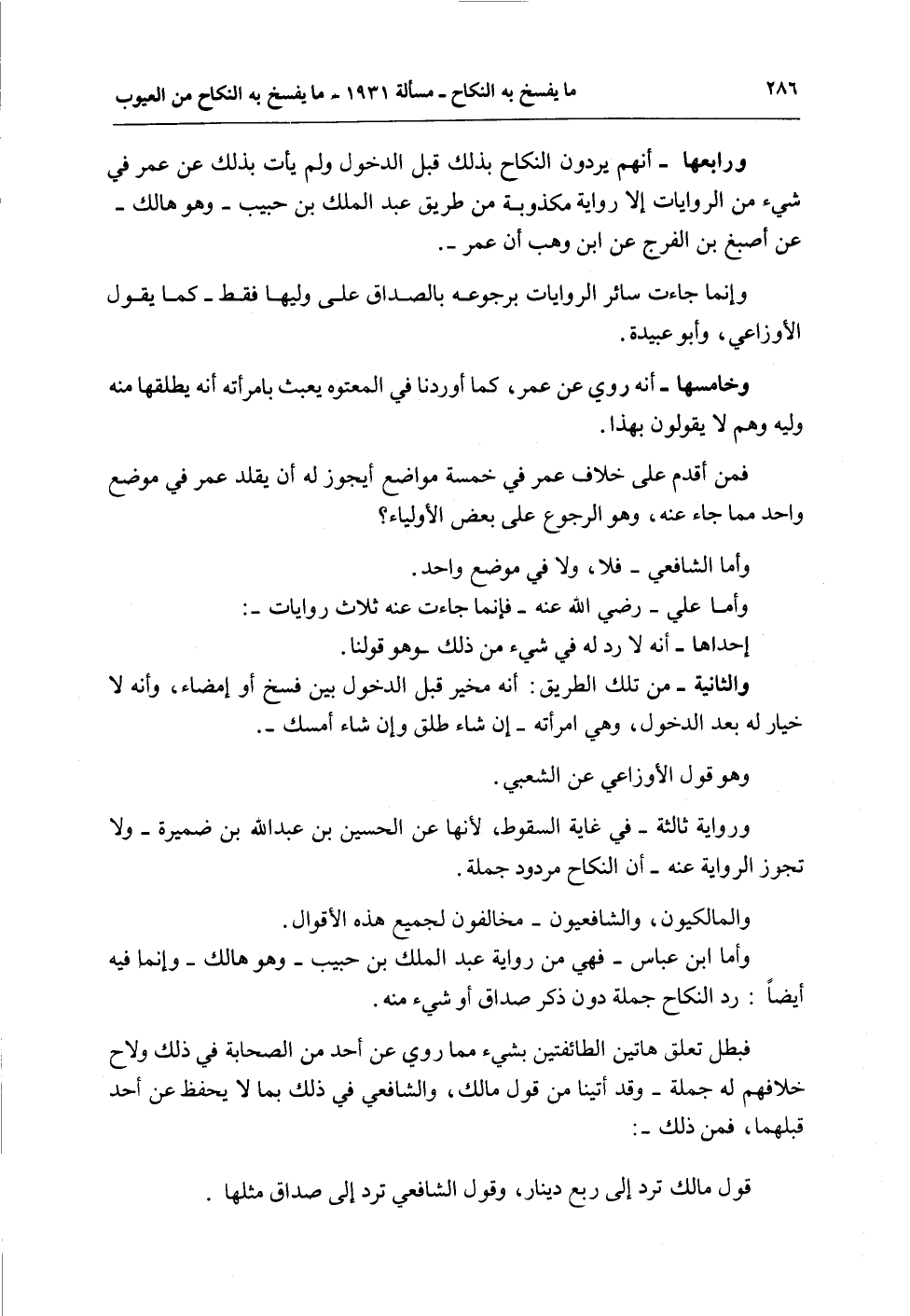 وَرَابِعُهَا - أَنَّهُمْ يَرُدُّونَ النِّكَاحَ بِذَلِكَ قَبْلَ الدُّخُولِ وَلَمْ يَأْتِ بِذَلِكَ عَنْ عُمَرَ فِي شَيْءٍ مِنْ الرِّوَايَاتِ إلَّا رِوَايَةٌ مَكْذُوبَةٌ مِنْ طَرِيقِ عَبْدِ الْمَلِكِ بْنِ حَبِيبٍ - وَهُوَ هَالِكٌ - عَنْ أَصْبَغَ بْنِ الْفَرَجِ عَنْ ابْنِ وَهْبٍ عَنْ عُمَرَ -.