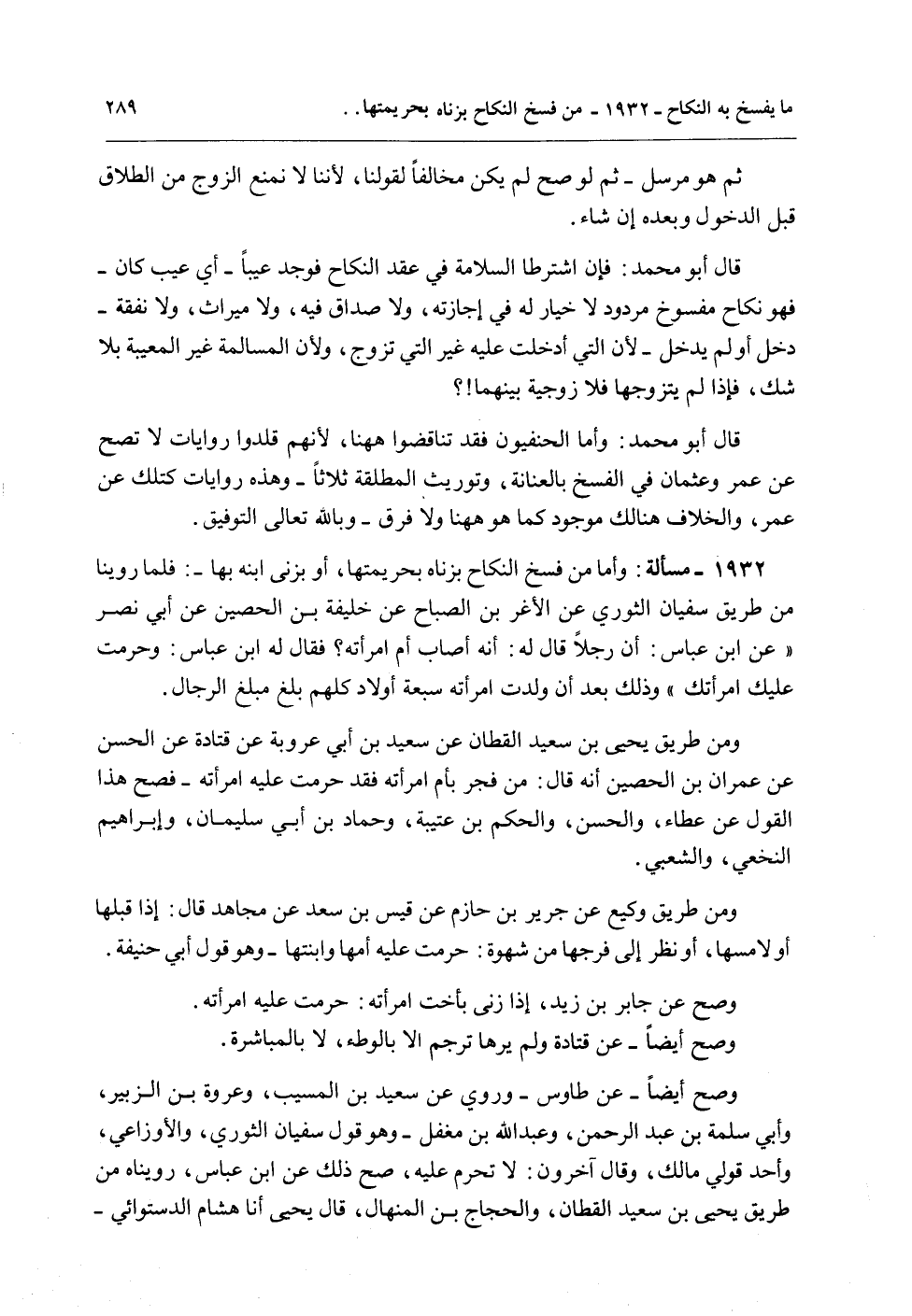 1932 - مَسْأَلَةٌ: وَأَمَّا مَنْ فُسِخَ النِّكَاحُ بِزِنَاهُ بِحَرِيمَتِهَا، أَوْ بِزِنَا ابْنِهِ بِهَا -: فَلِمَا رُوِّينَا مِنْ طَرِيقِ سُفْيَانَ الثَّوْرِيِّ عَنْ الْأَغَرِّ بْنِ الصَّبَّاحِ عَنْ خَلِيفَةَ بْنِ الْحُصَيْنِ عَنْ أَبِي نَصْرٍ " عَنْ ابْنِ عَبَّاسٍ: أَنَّ رَجُلًا قَالَ لَهُ: إنَّهُ أَصَابَ أُمَّ امْرَأَتِهِ؟ فَقَالَ لَهُ ابْنُ عَبَّاسٍ: وَحَرُمَتْ عَلَيْك امْرَأَتُك " وَذَلِكَ بَعْدَ أَنْ وَلَدَتْ امْرَأَتُهُ سَبْعَةَ أَوْلَادٍ بَلَغَ مَبْلَغَ الرِّجَالِ.